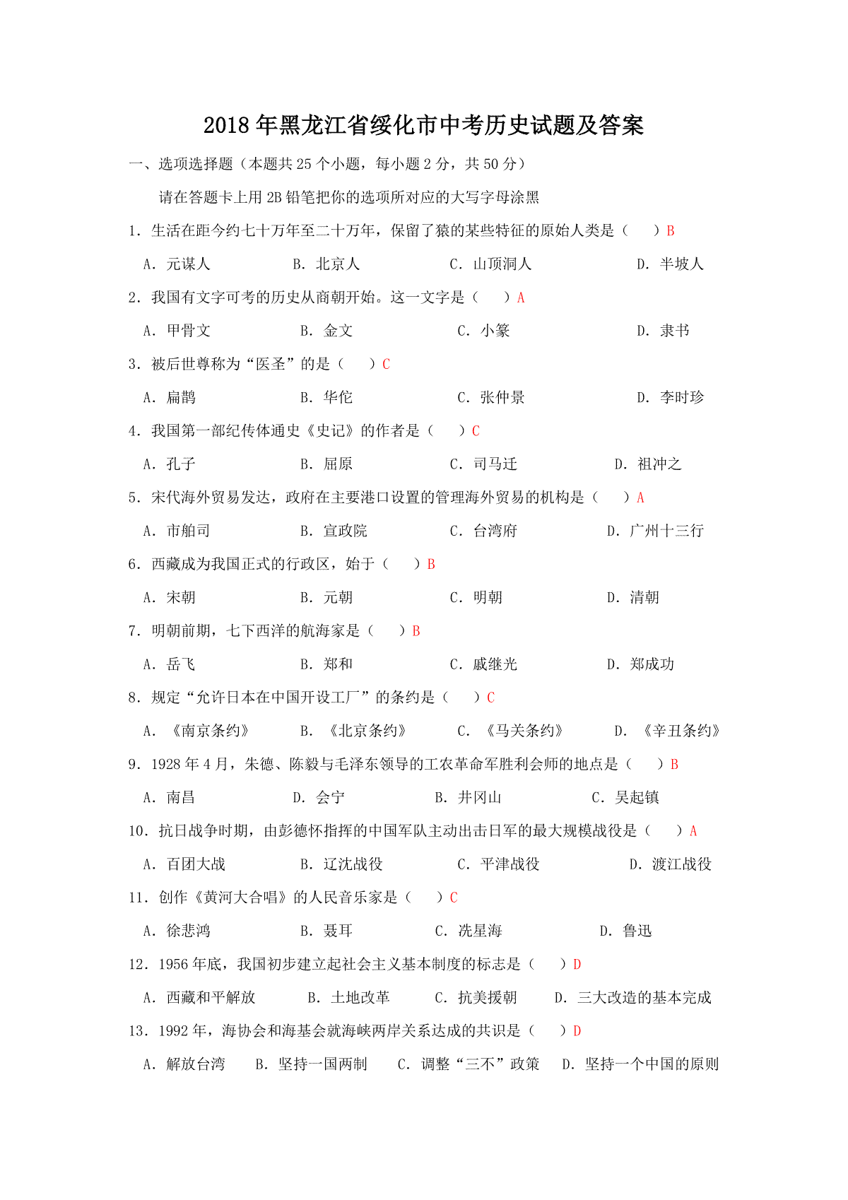 一、2018年黑龙江省绥化市中考历史试题及答案