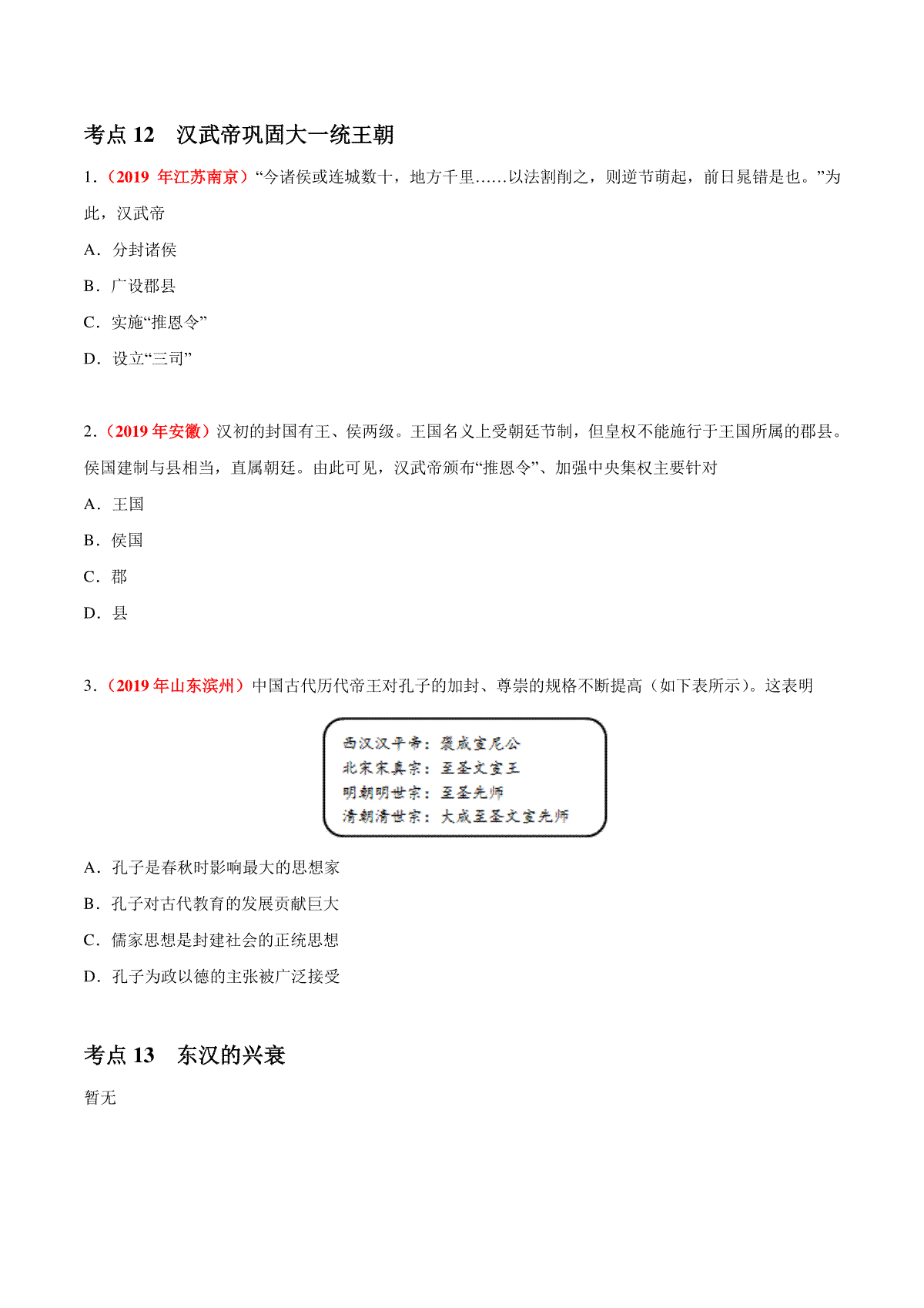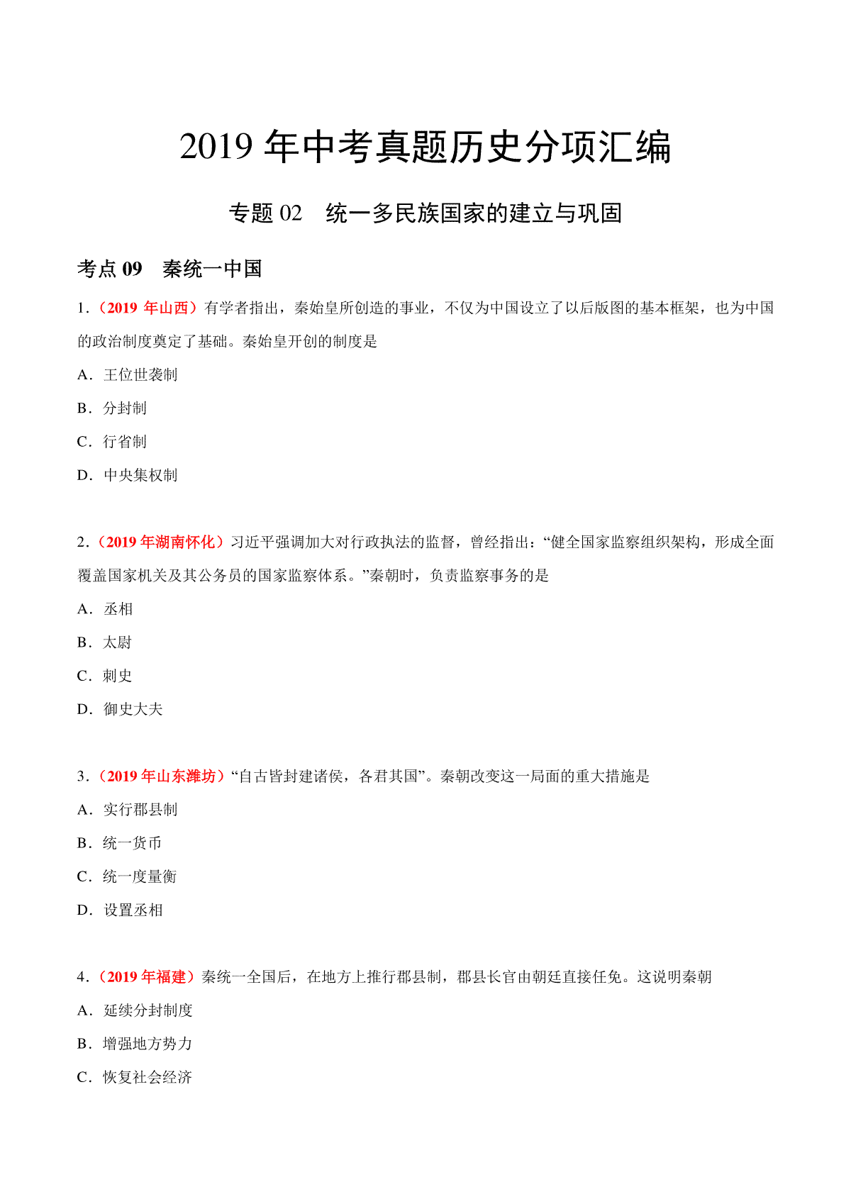 1.专题02 统一多民族国家的建立与巩固(第01期)-2019年中考真题历史试题分项汇编(原卷版)