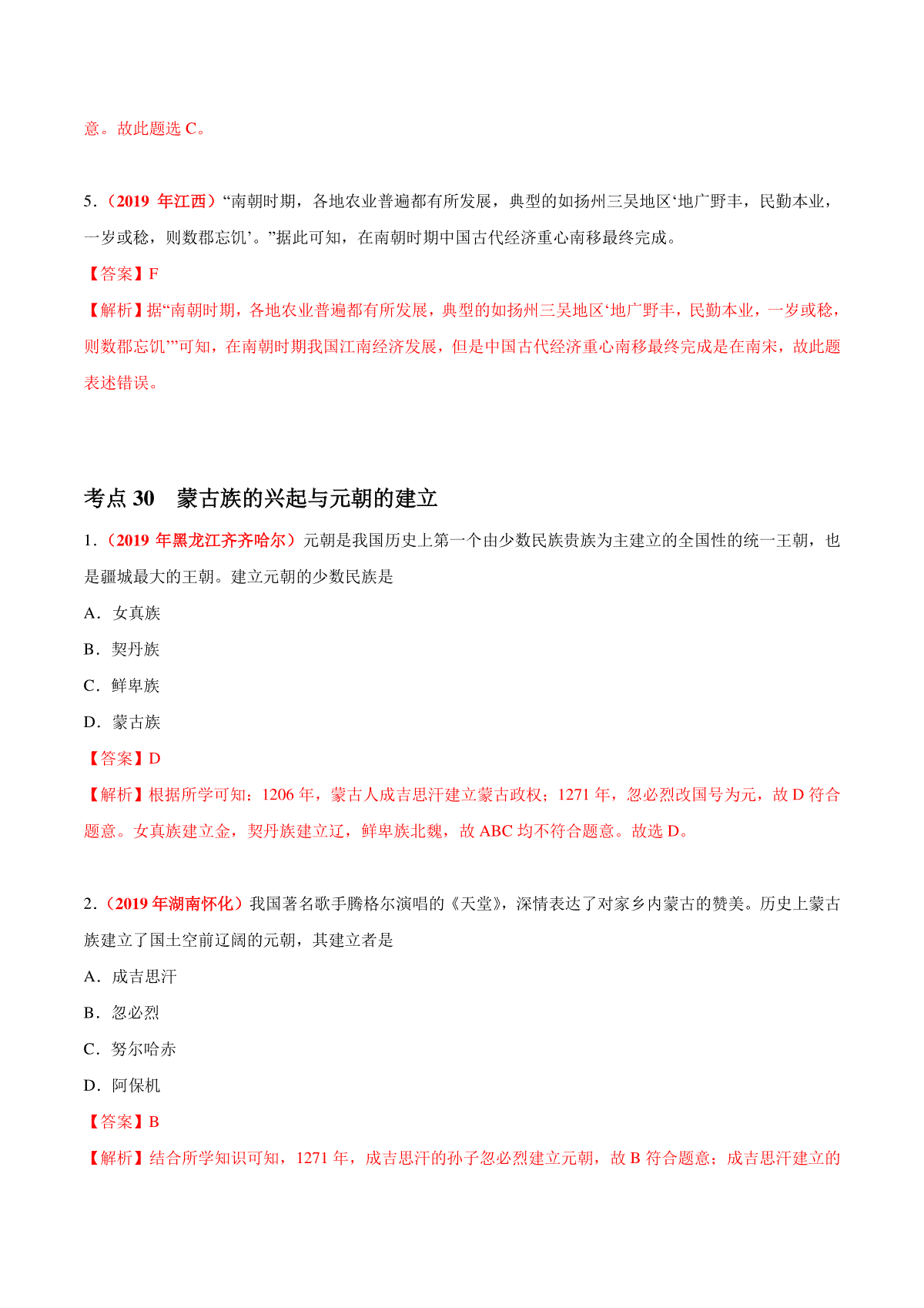 5.专题03 政权分立与民族交融(第01期)-2019年中考真题历史试题分项汇编(解析版)