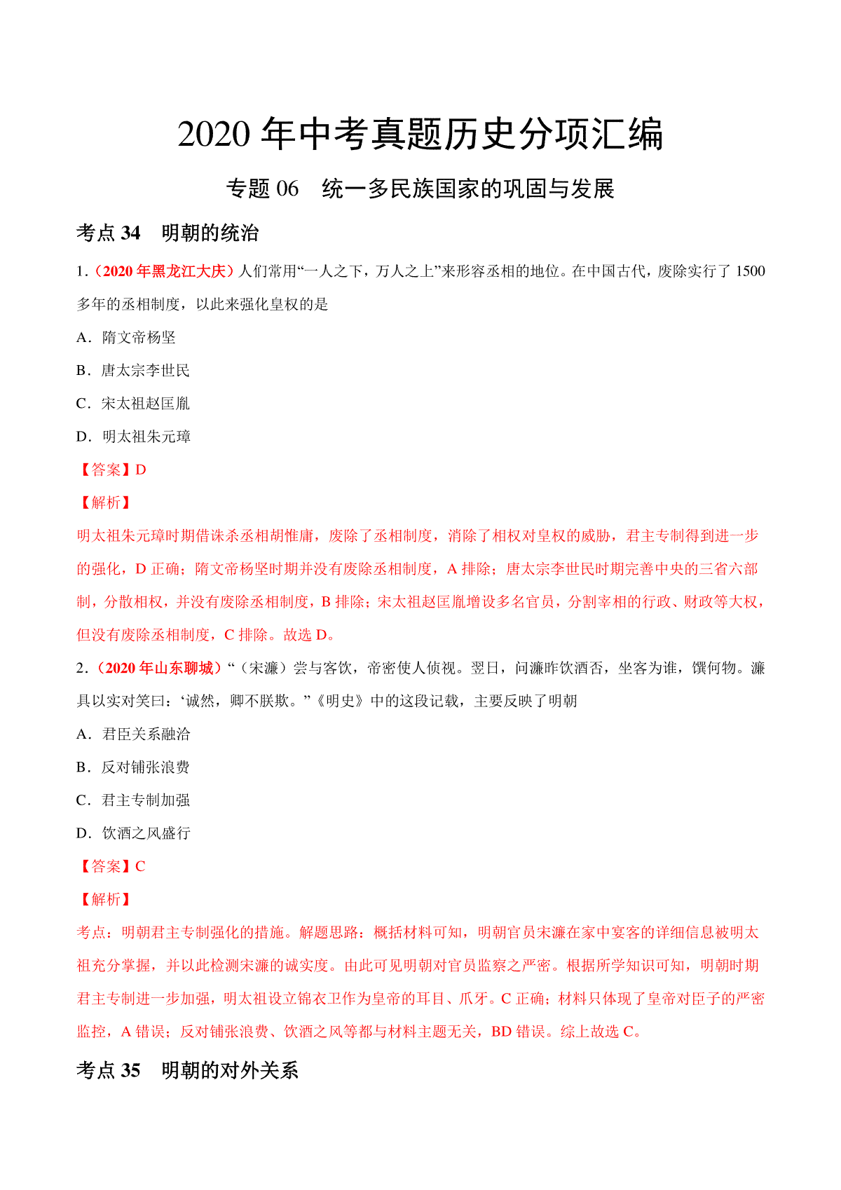 1.专题06 统一多民族国家的巩固与发展(第01期)-2020年中考历史真题分项汇编(解析版)