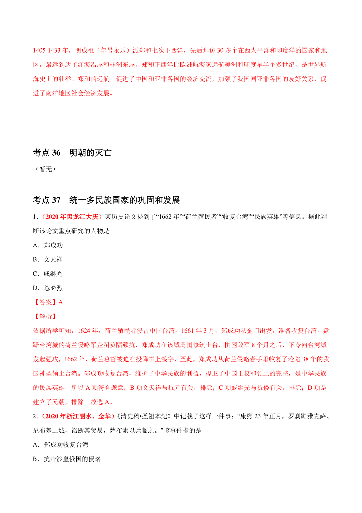 一、专题06 统一多民族国家的巩固与发展(第01期)-2020年中考历史真题分项汇编(解析版)