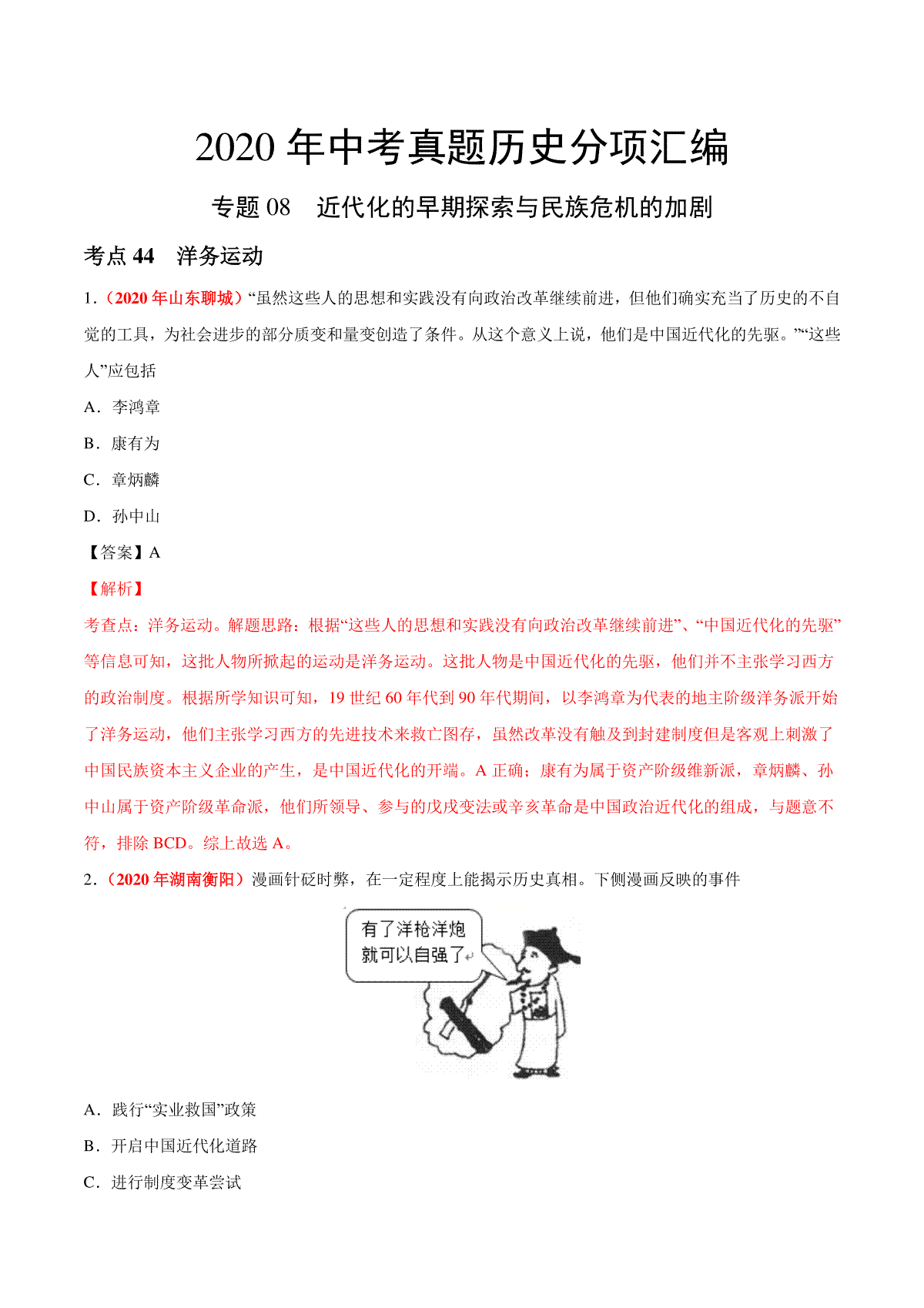 1.专题08 近代化的早期探索与民族危机的加剧(第01期)-2020年中考历史真题分项汇编(解析版)