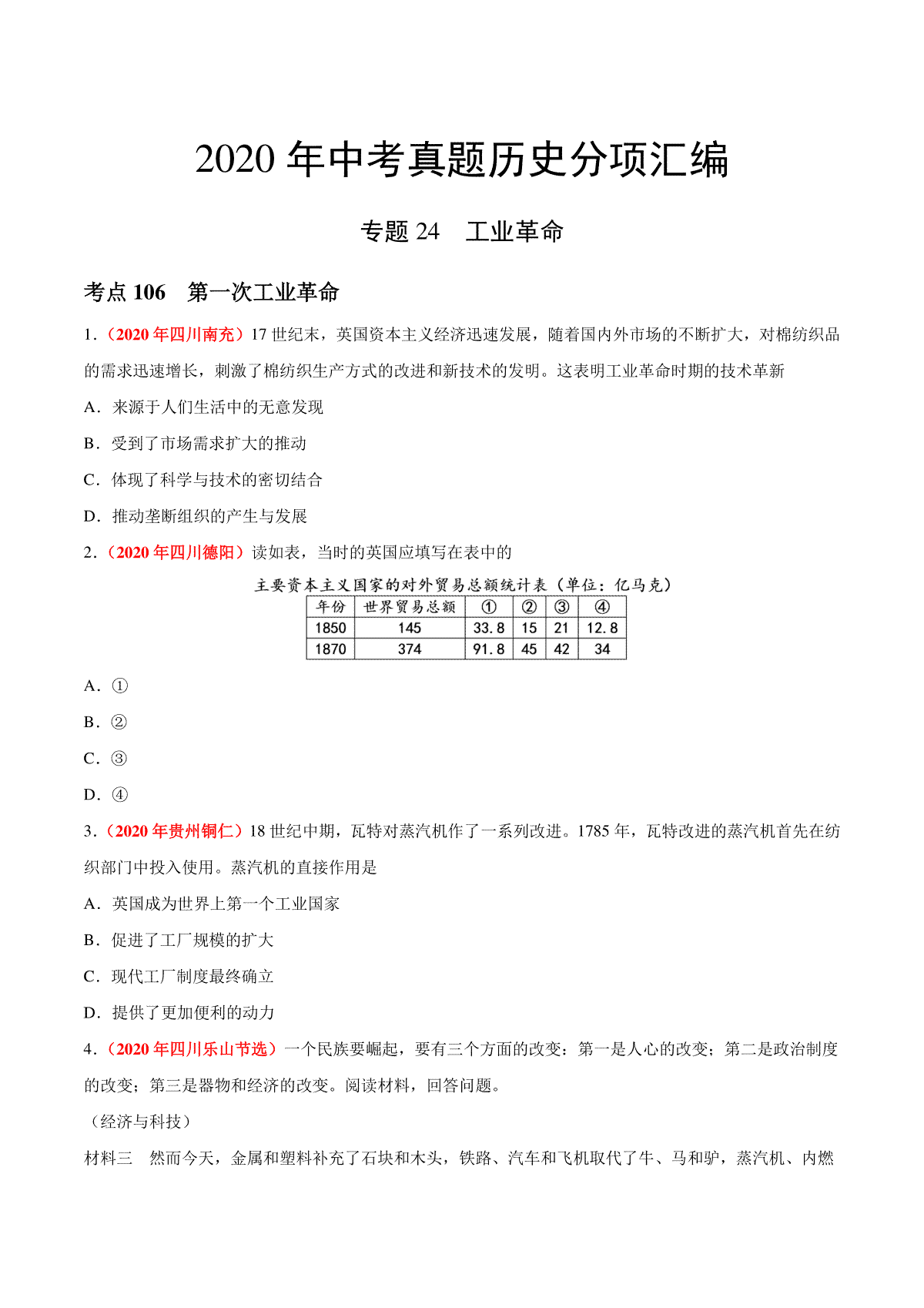 1.专题24 工业革命(第01期)-2020年中考历史真题分项汇编(原卷版)