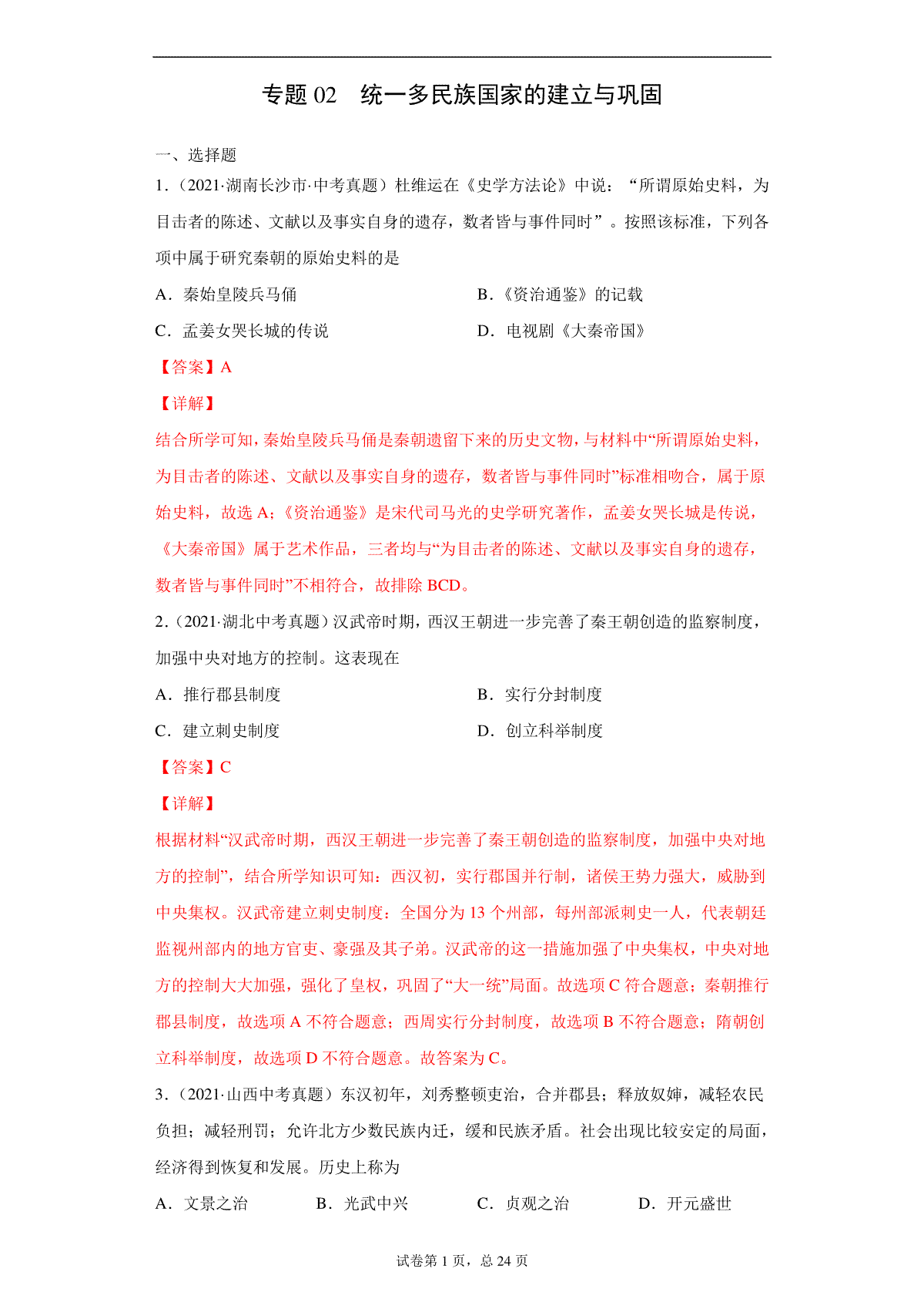 如果你想下载专题02 统一多民族国家的建立与巩固(第01期)(解析版)DOC或PDF版,请点击本文末链接!