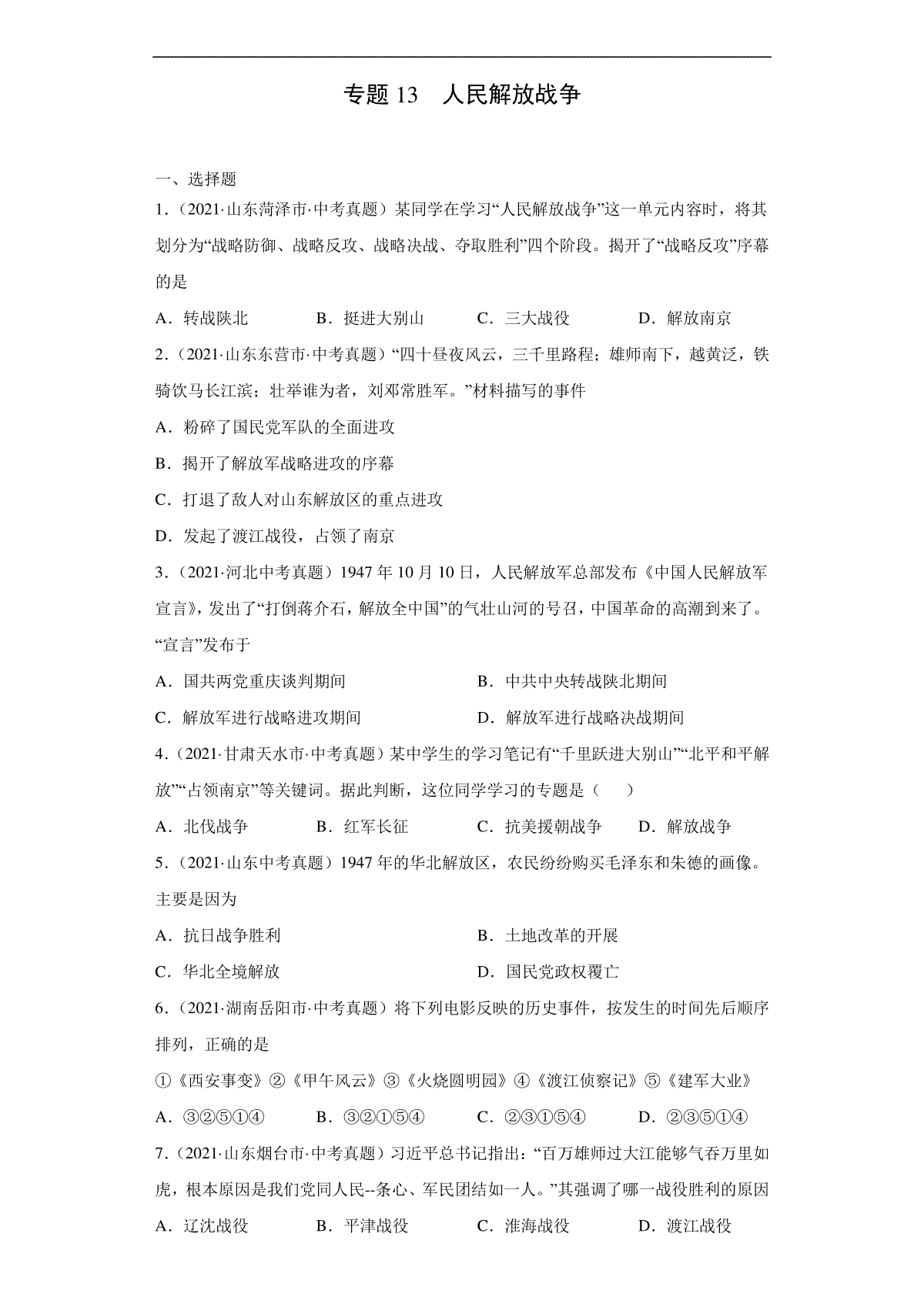 下载专题13 人民解放战争(第01期)(原卷版)PDF格式或doc