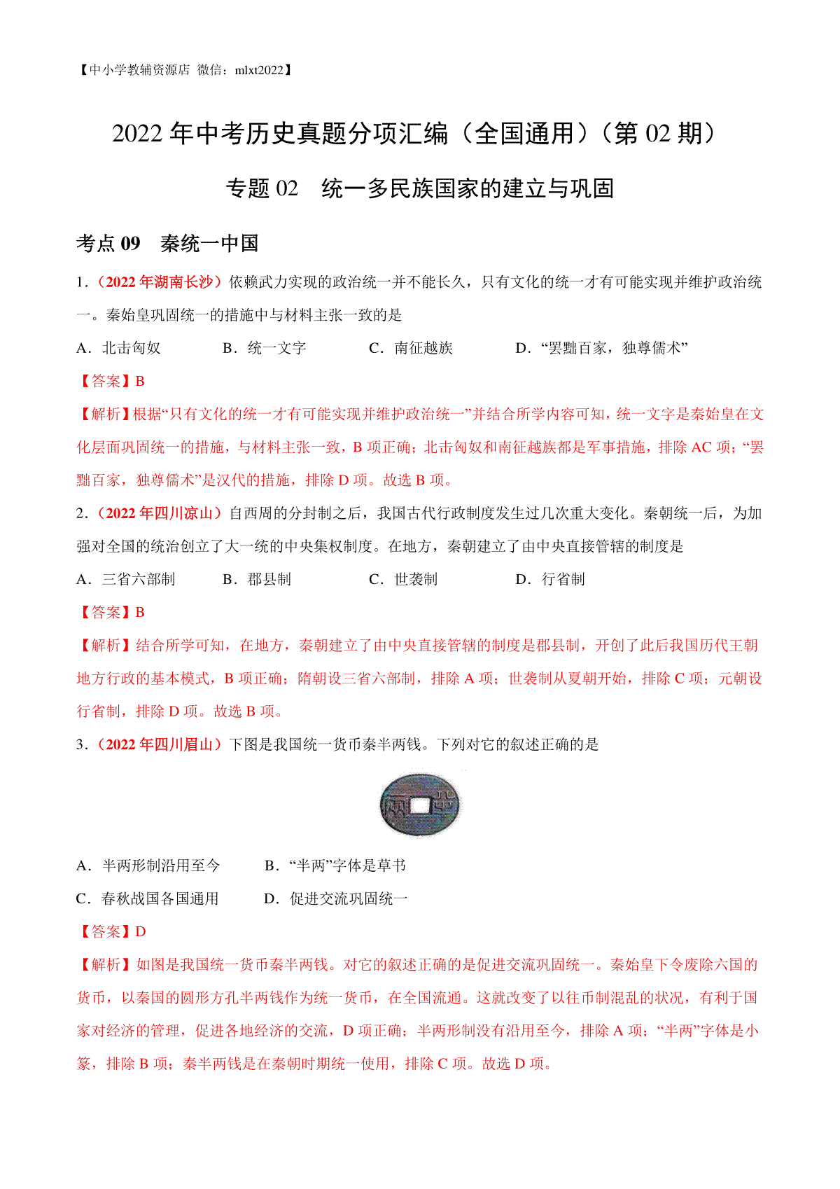 1.专题02 统一多民族国家的建立与巩固(第01期)-2022年中考历史真题分项汇编(全国通用)(解析版