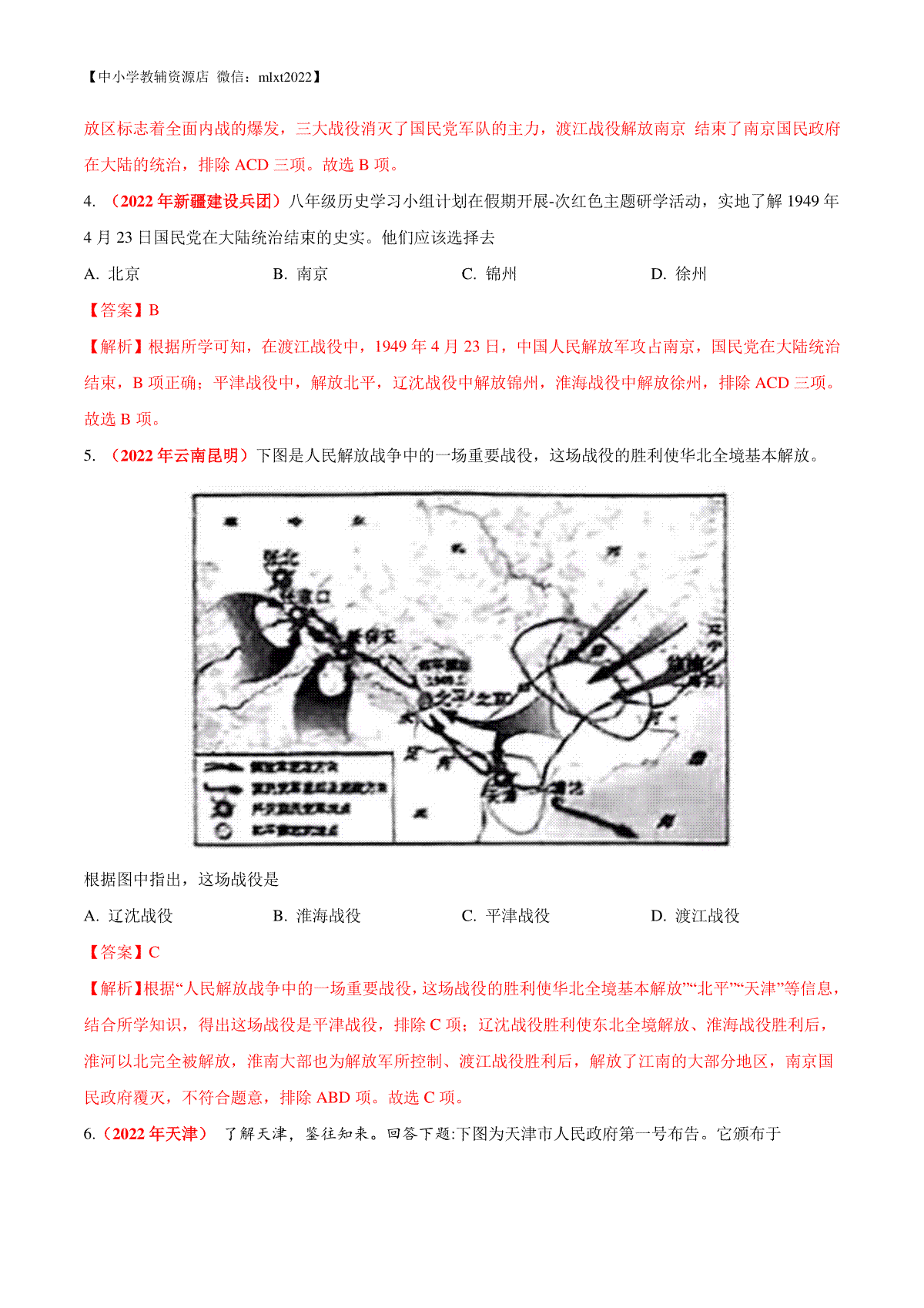 一、专题13 人民解放战争(第01期)-2022年中考历史真题分项汇编(全国通用)(解析版)