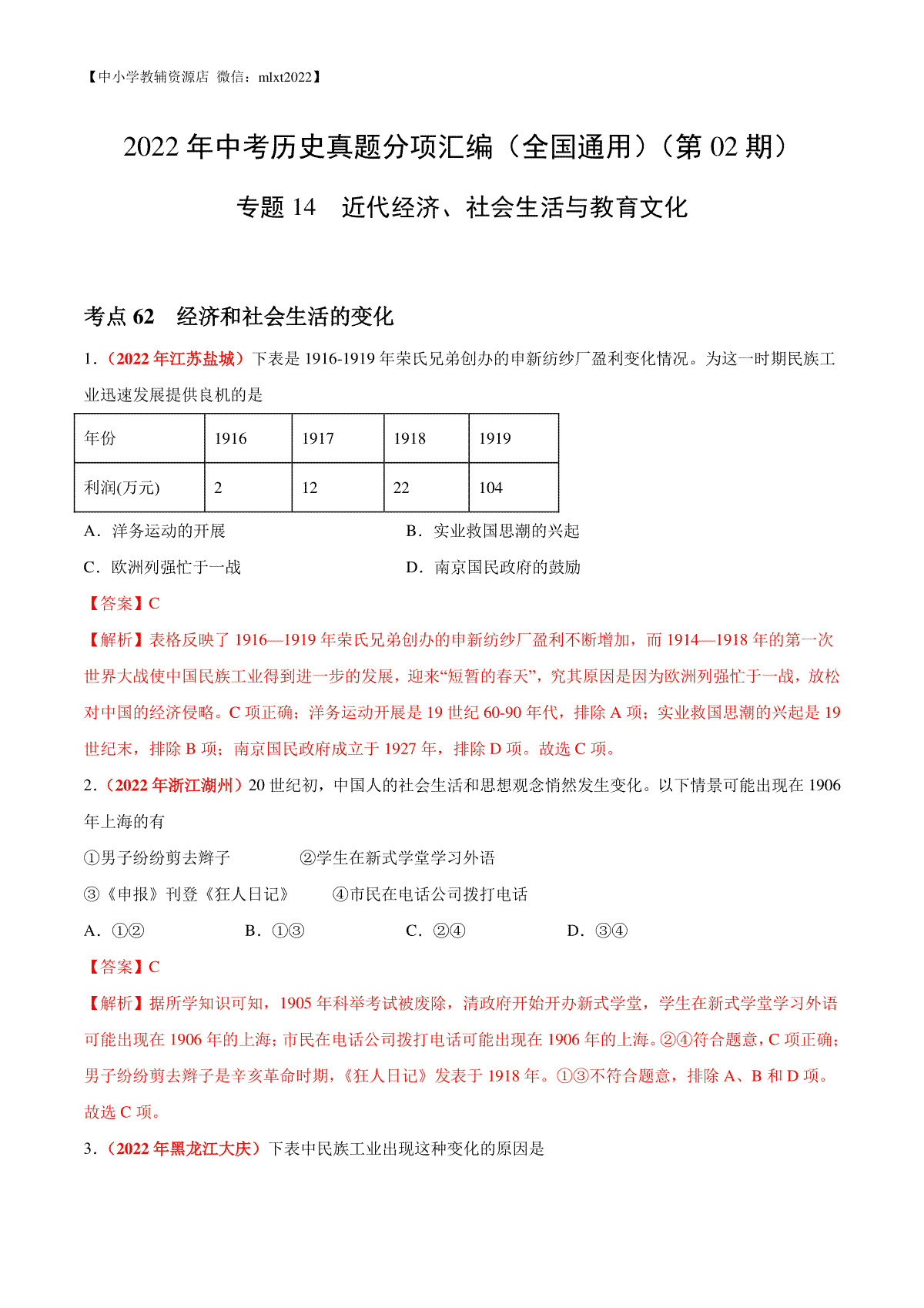 1.专题14 近代经济、社会生活与教育文化(第01期)-2022年中考历史真题分项汇编(全国通用)(解析