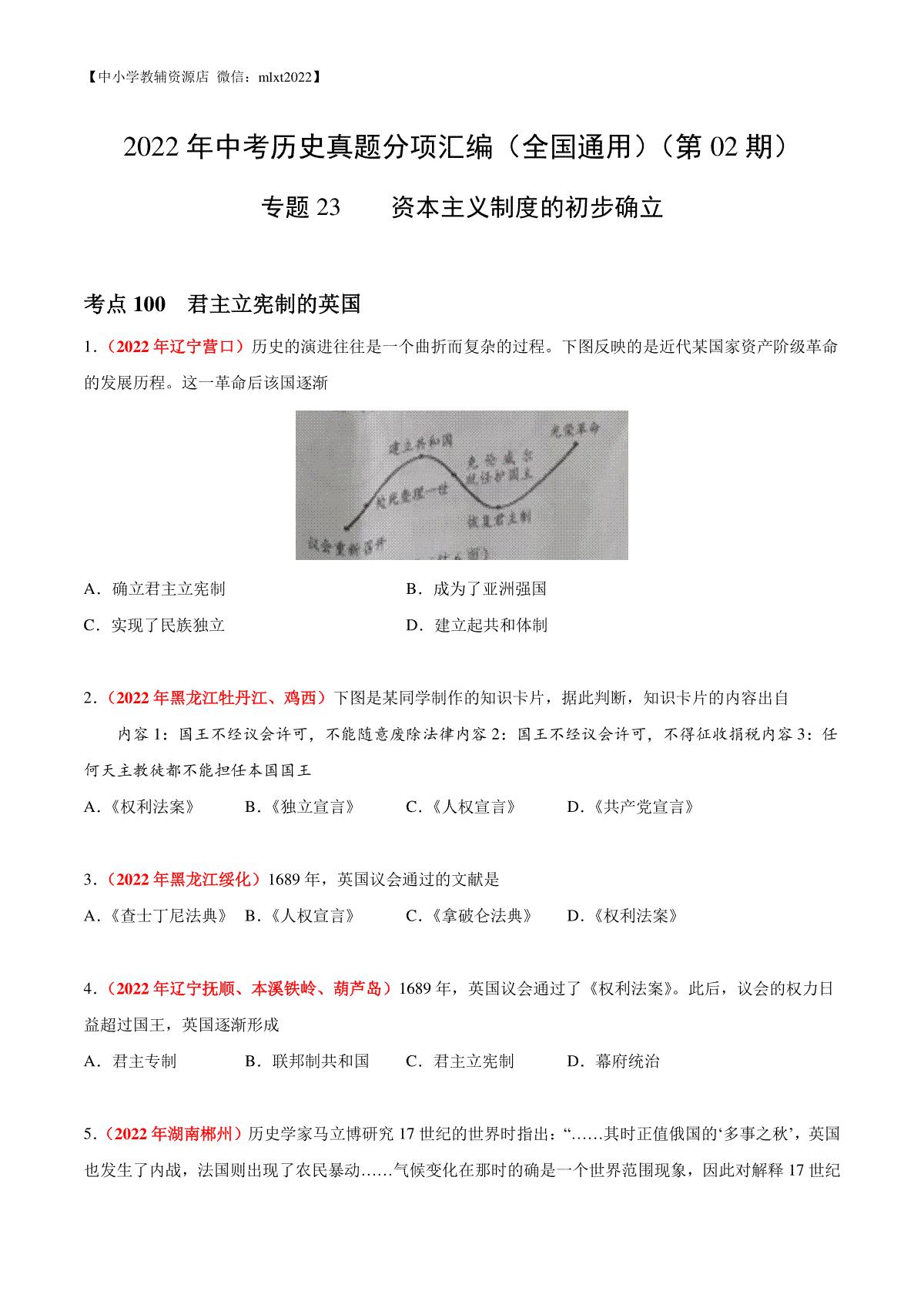 1.专题23 资本主义制度的初步确立(第01期)-2022年中考历史真题分项汇编(全国通用)(原卷版)