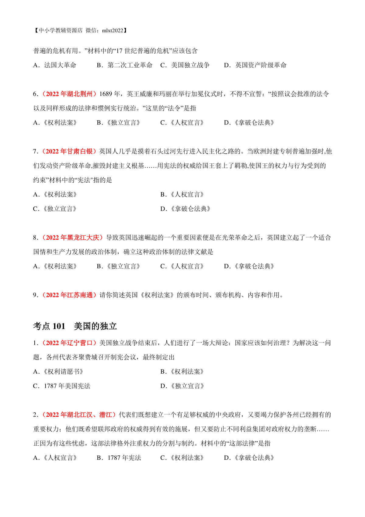 下载专题23 资本主义制度的初步确立(第02期)-2022年中考历史真题分项汇编(全国通用)(原卷版)PDF格式或doc