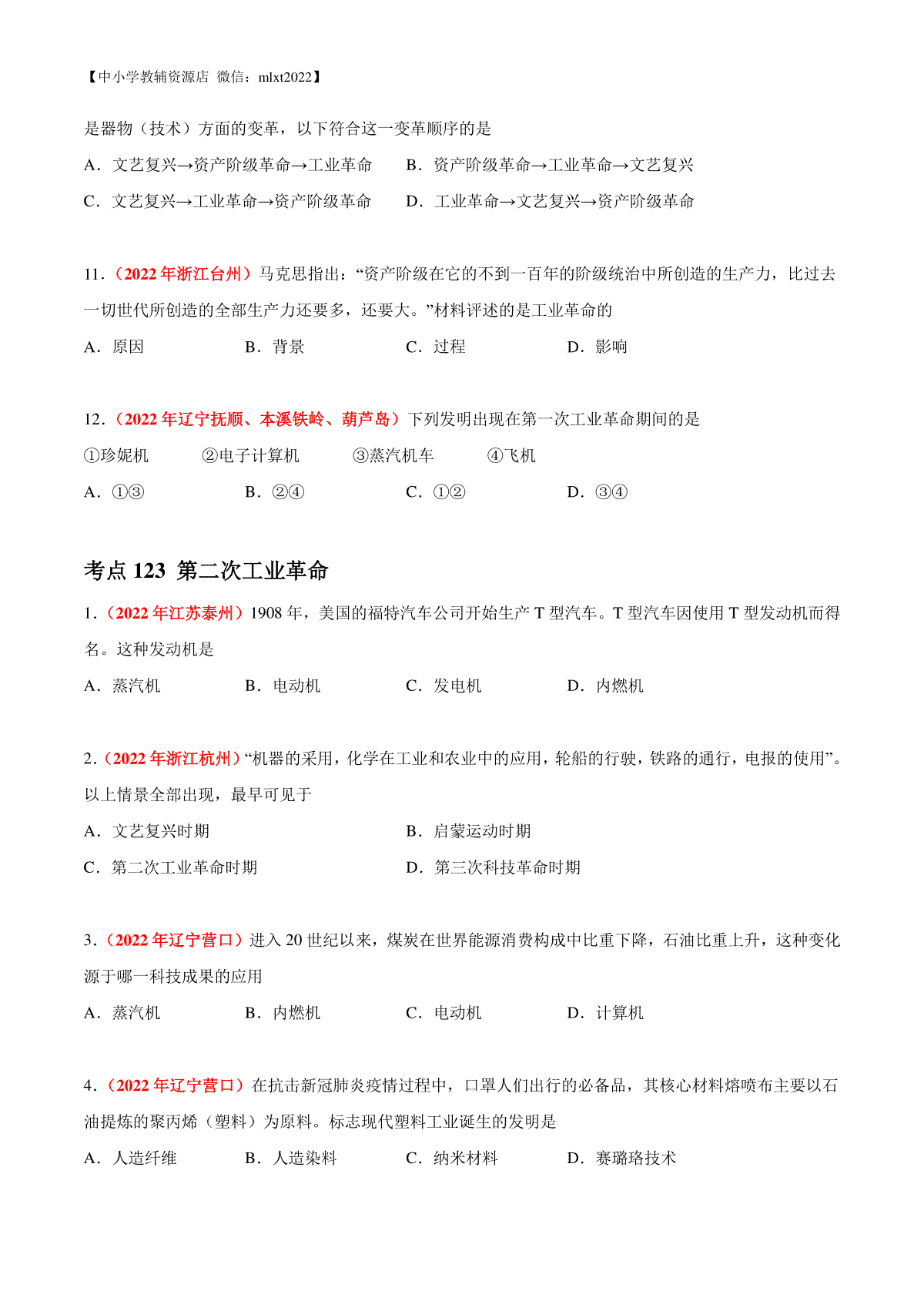一、专题30 三次科技革命(第02期)-2022年中考历史真题分项汇编(全国通用)(原卷版)