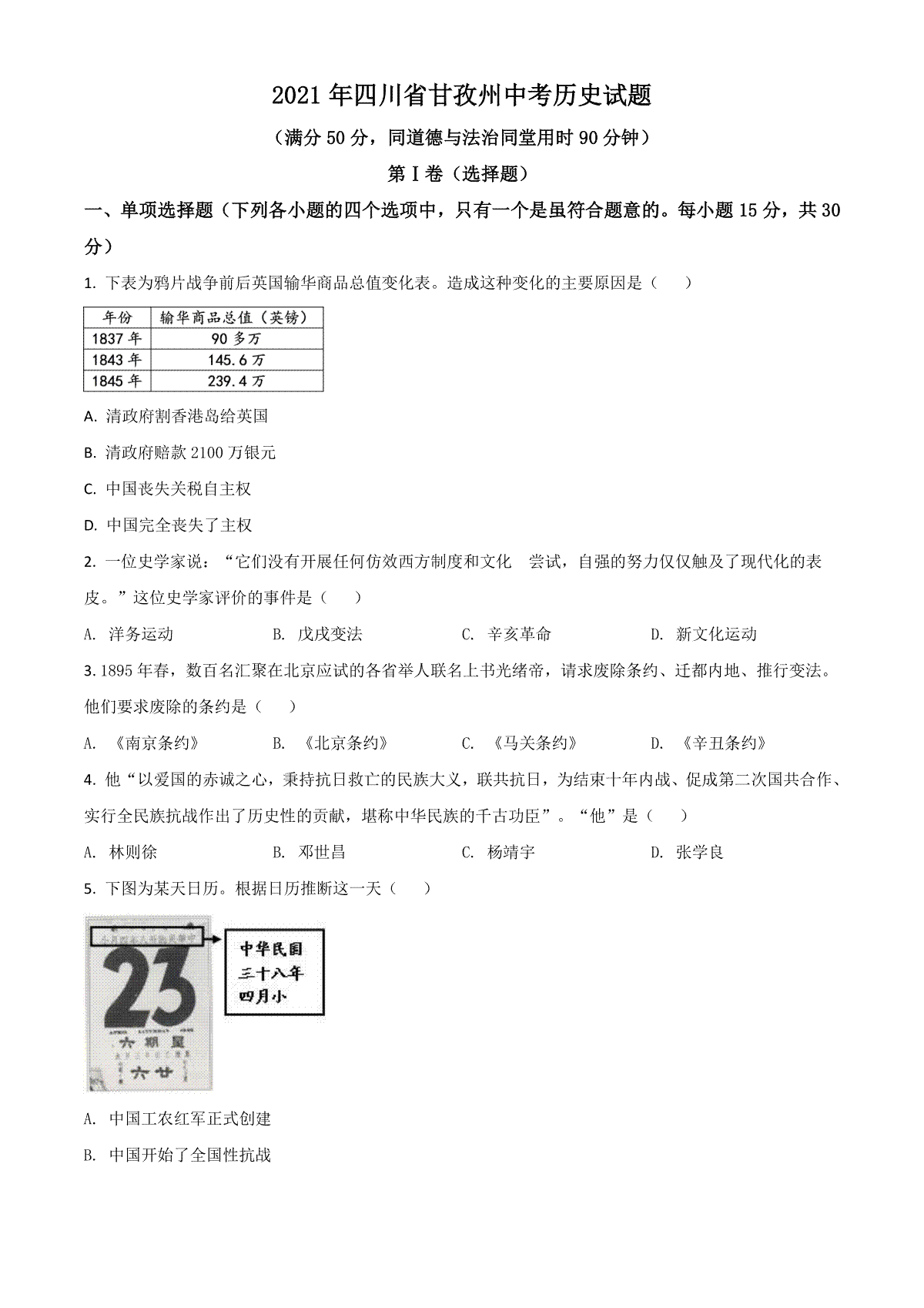1.四川省甘孜州2021年中考历史试题(原卷版)