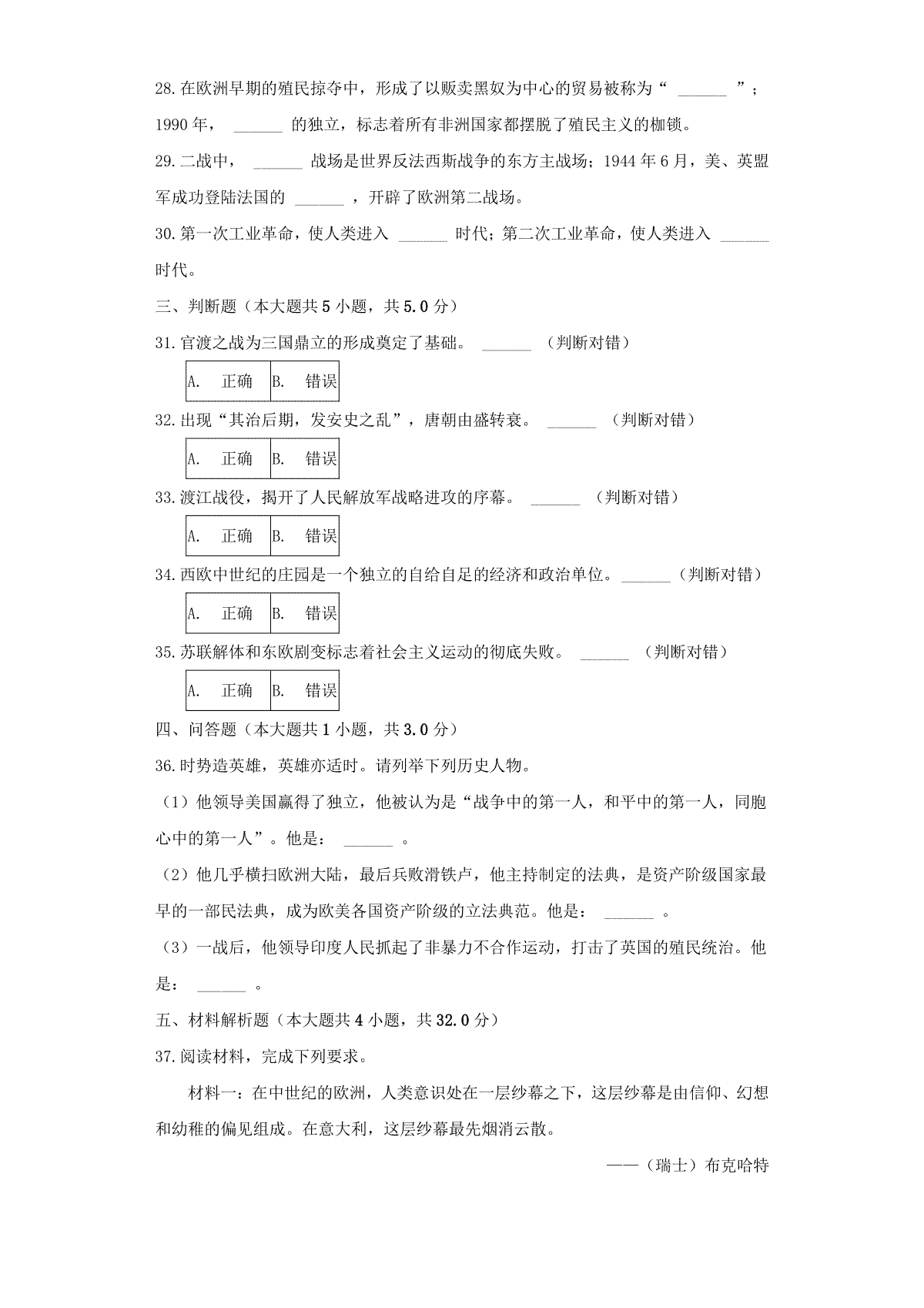 2020年安徽省历史中考试题及答案