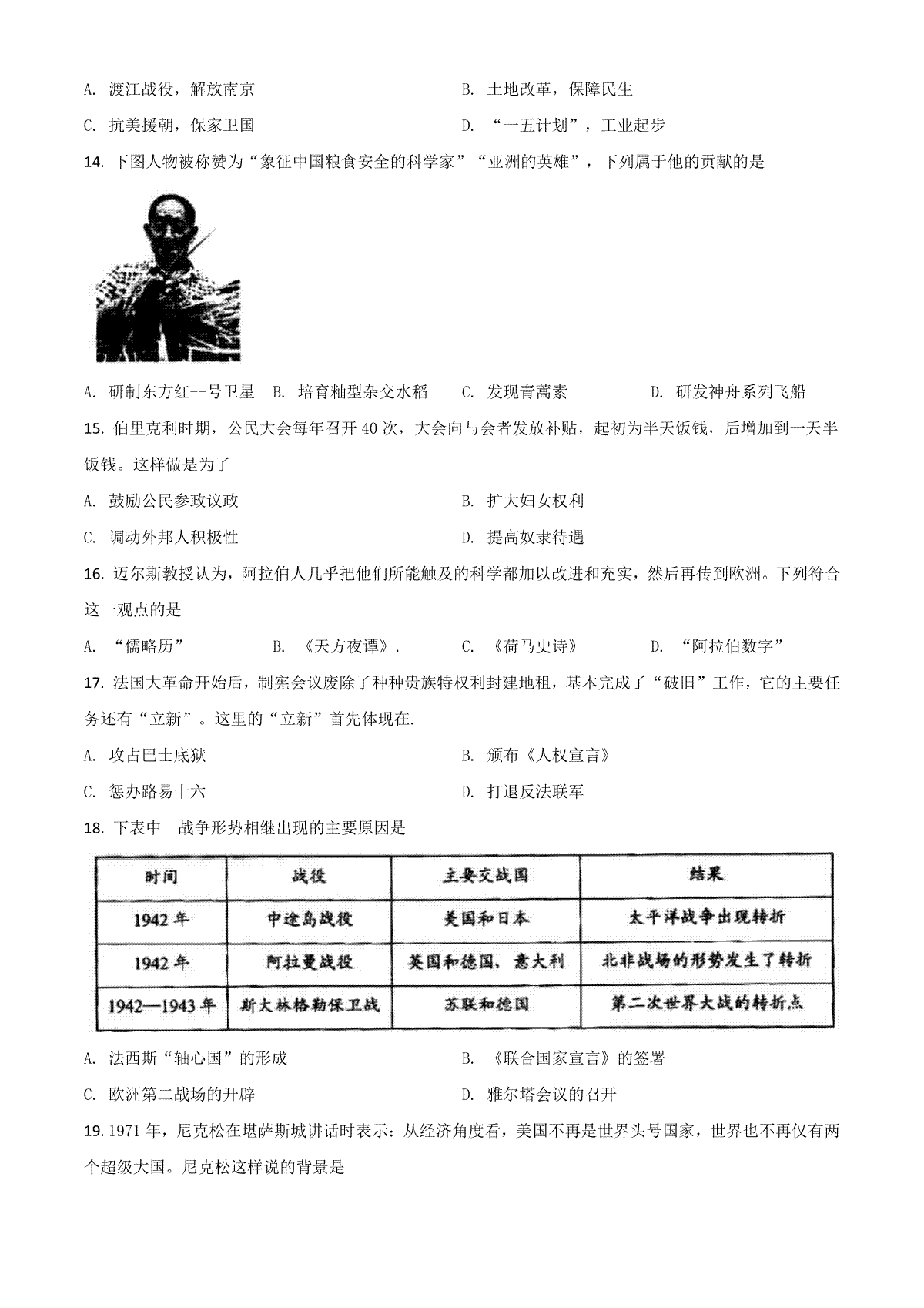 2019年安徽省历史中考试题及答案