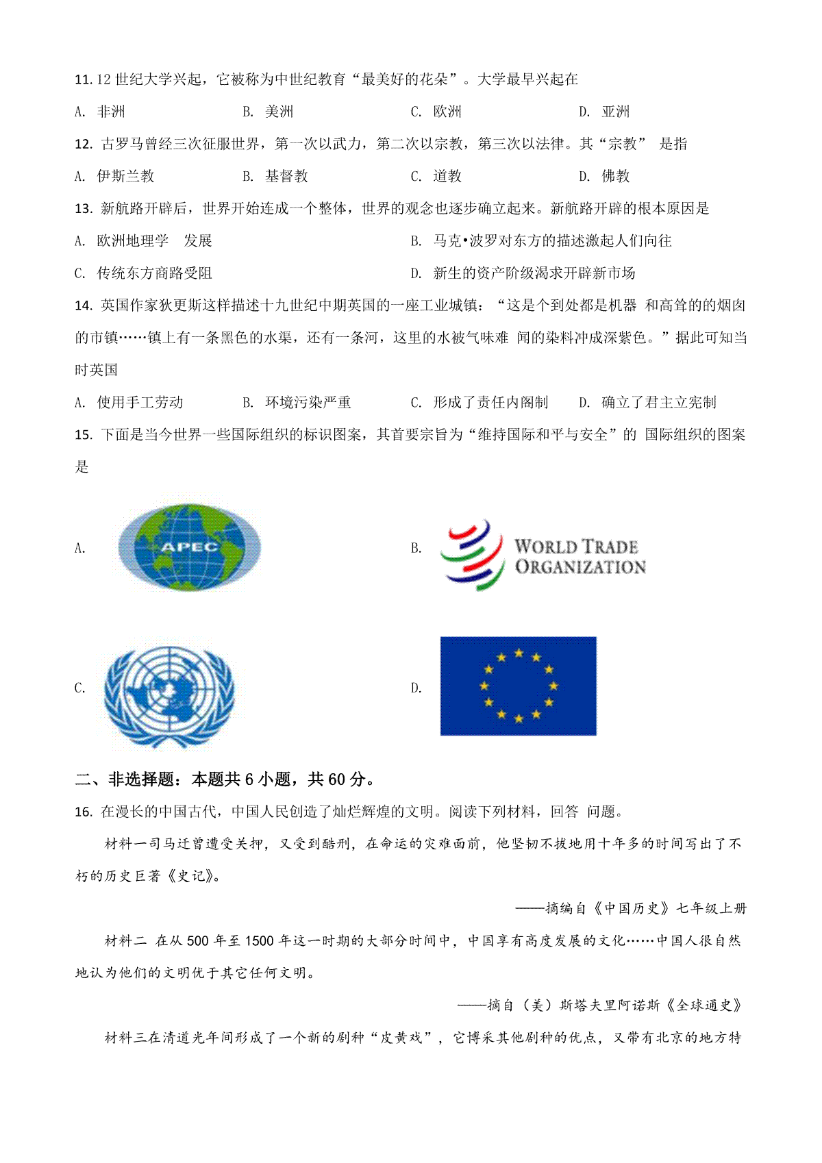 2020年安徽省历史中考试题及答案