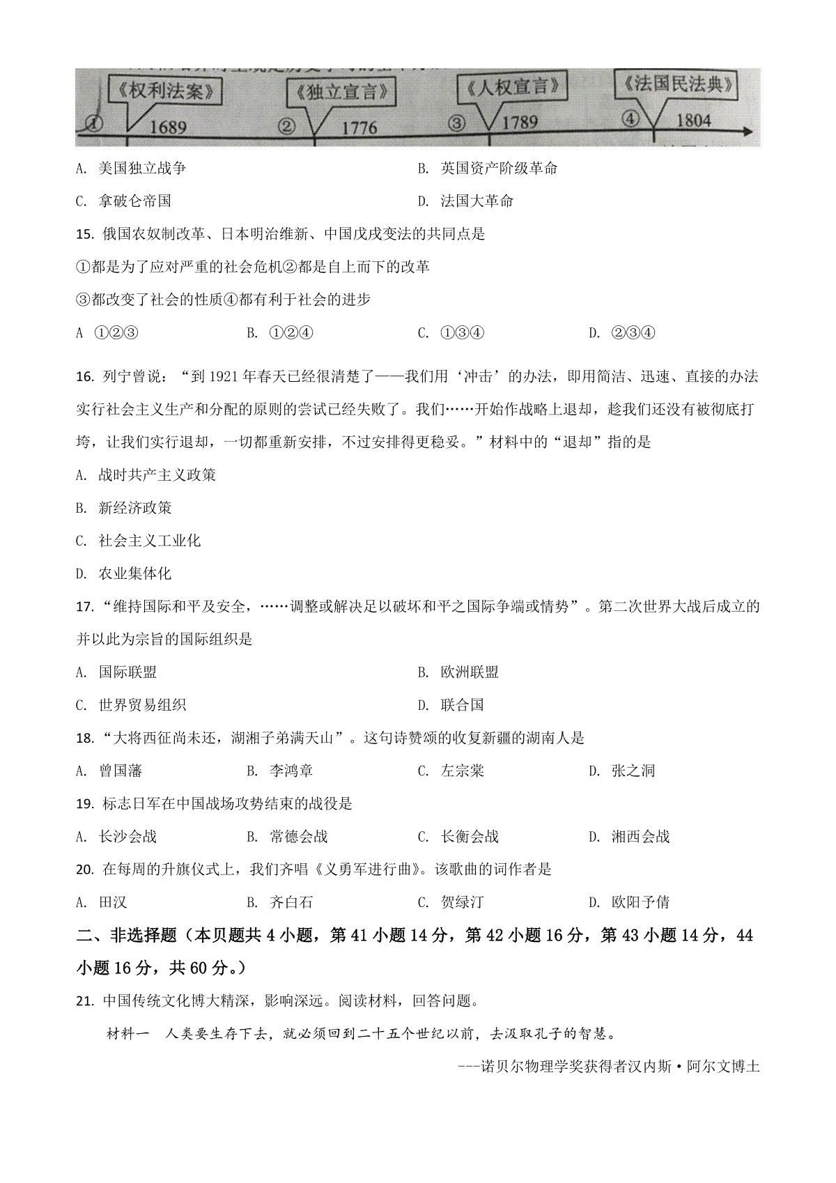 3.湖南省娄底市2021年中考历史试题(原卷版)