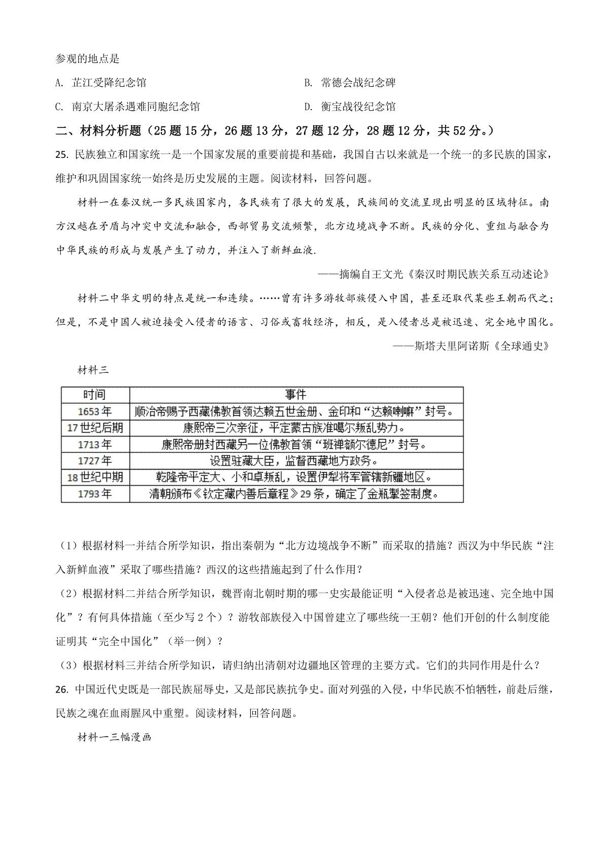 2021年安徽省历史中考试题及答案