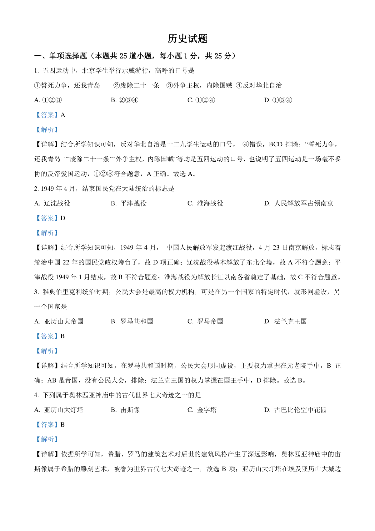 一、辽宁省阜新市2021年中考历史试题(解析版)