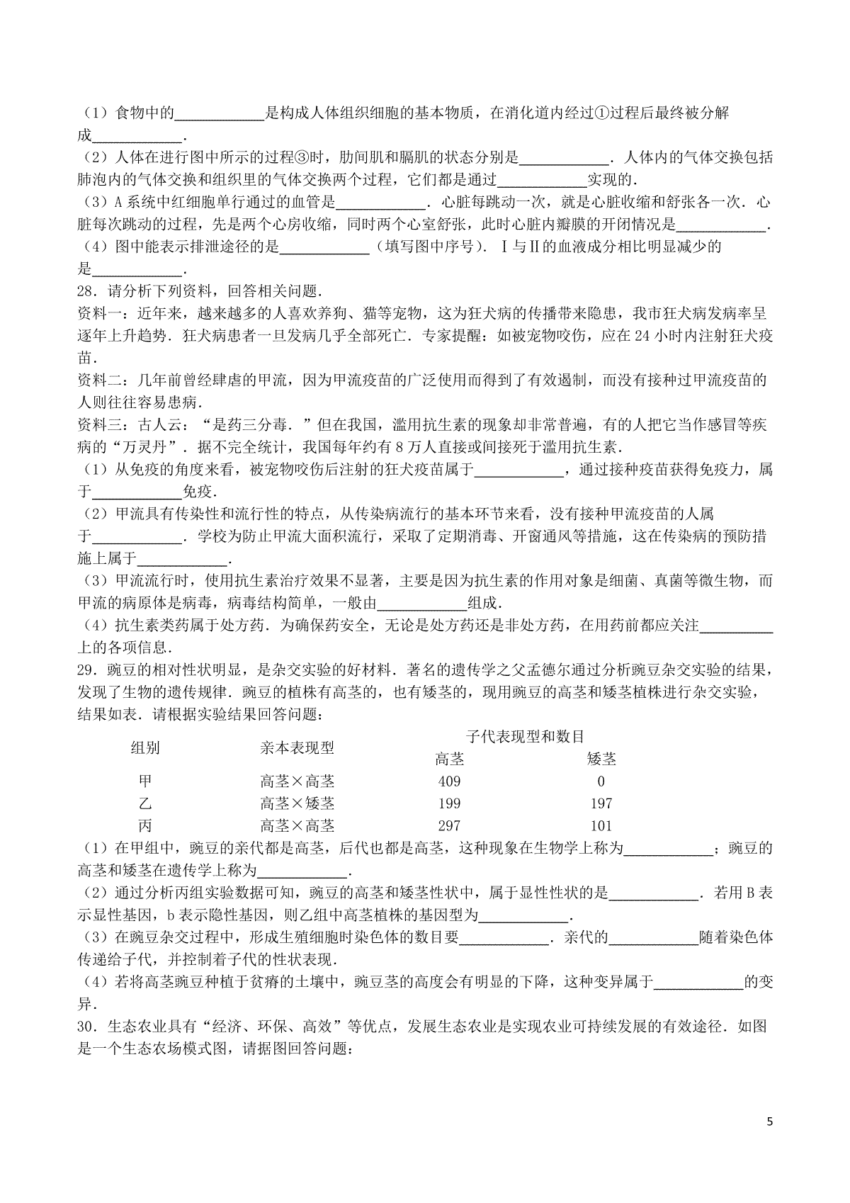 湖南省益阳市2015年中考生物真题试题(含扫描答案)