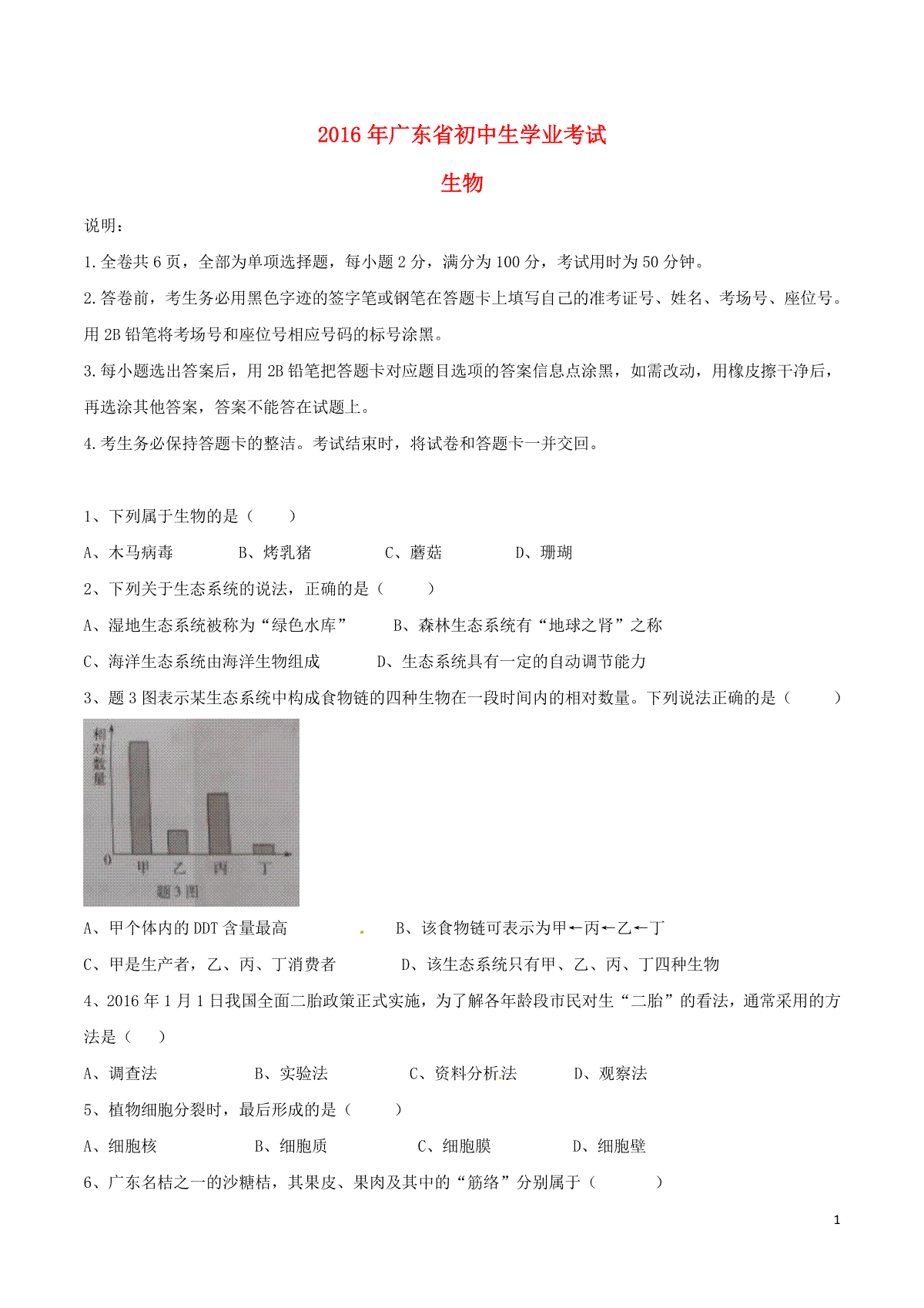 1.广东省2016年中考生物真题试题(含答案)
