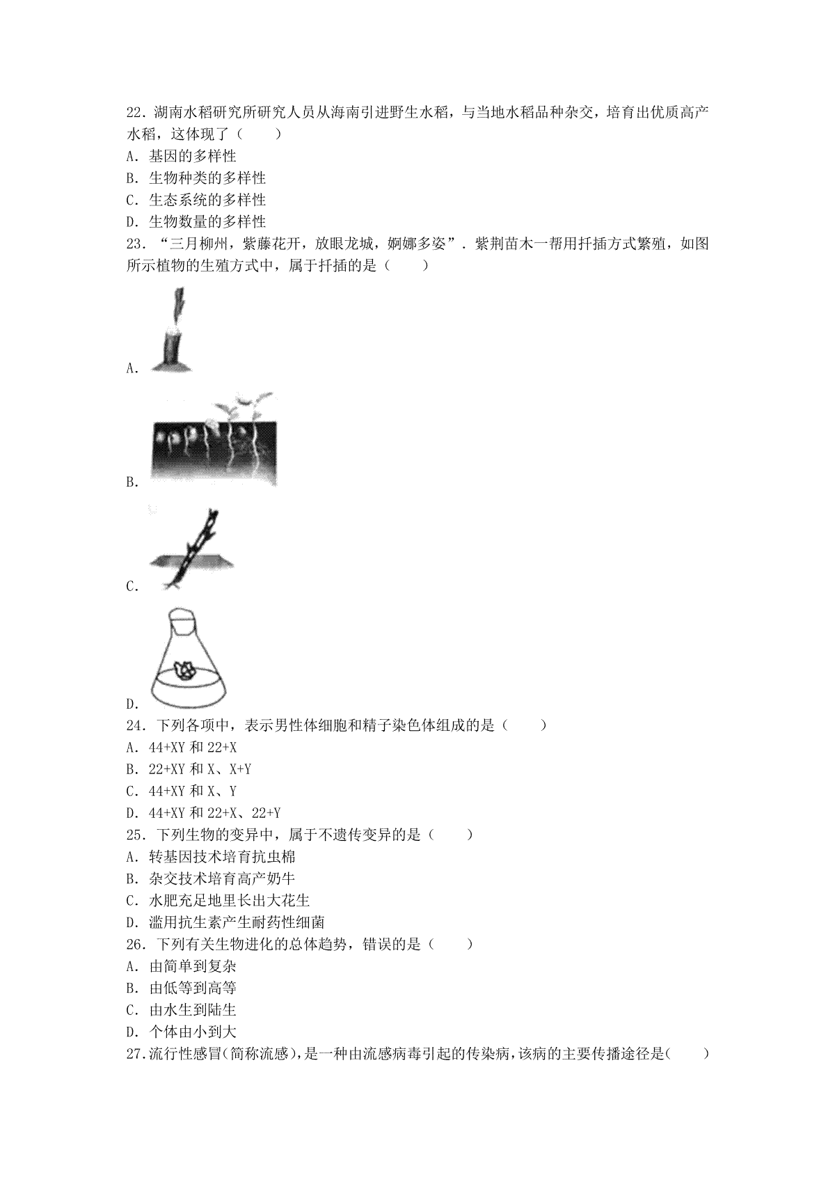 湖南省益阳市2015年中考生物真题试题(含扫描答案)