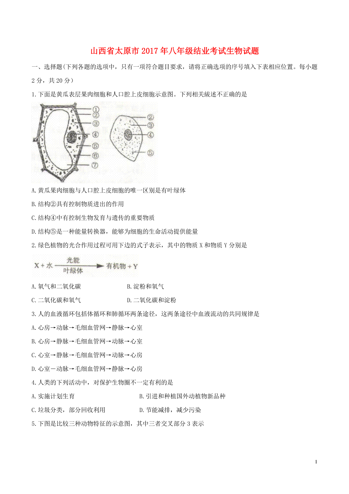 1.山西省太原市2017年中考生物真题试题(含答案)