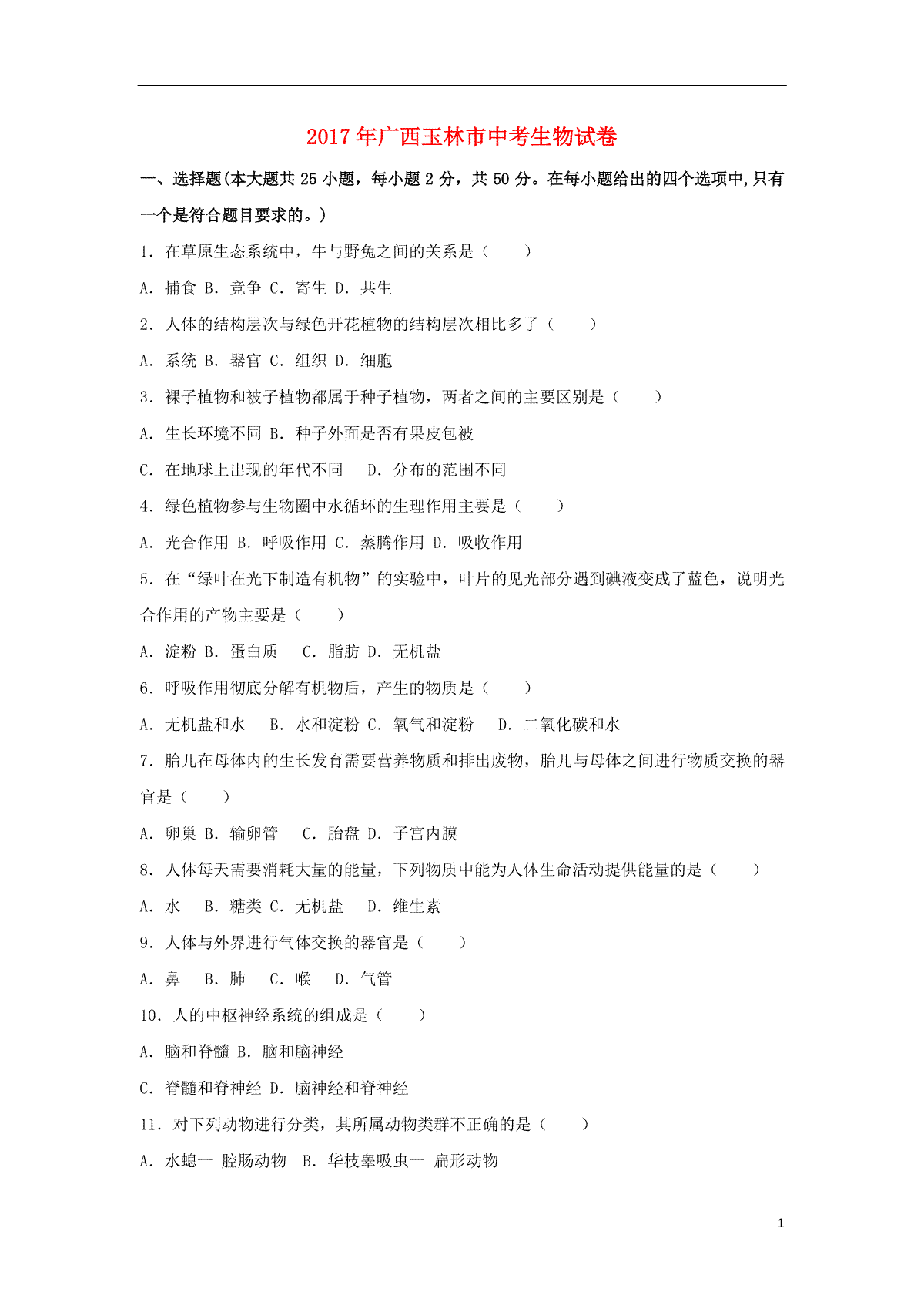 1.广西玉林市2017年中考生物真题试题(含解析)