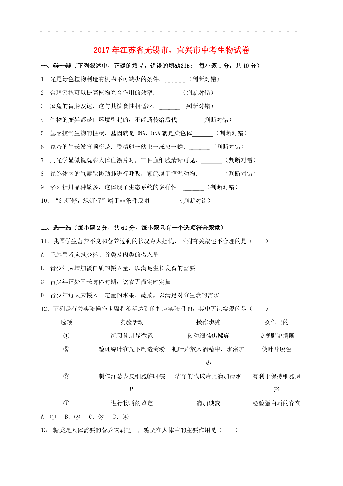 1.江苏省无锡市、宜兴市2017年中考生物真题试题(含解析)