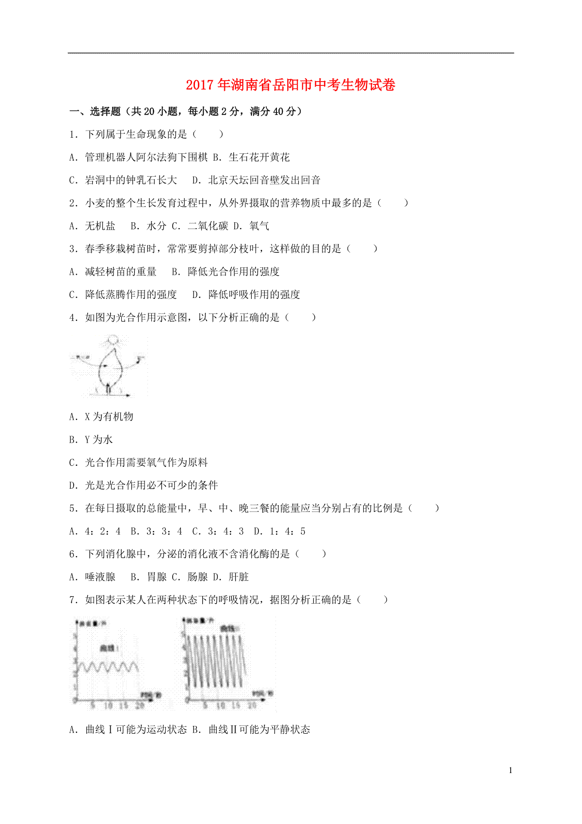 1.湖南省岳阳市2017年中考生物真题试题(含解析)