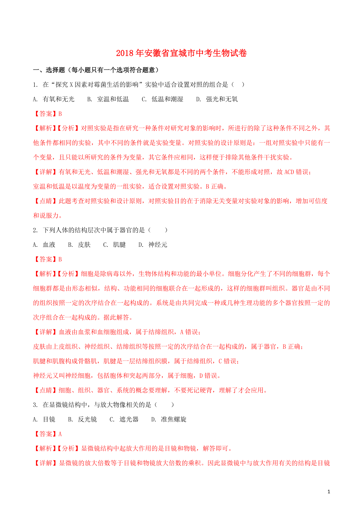 1.安徽省宣城市2018年中考生物真题试题(含解析)
