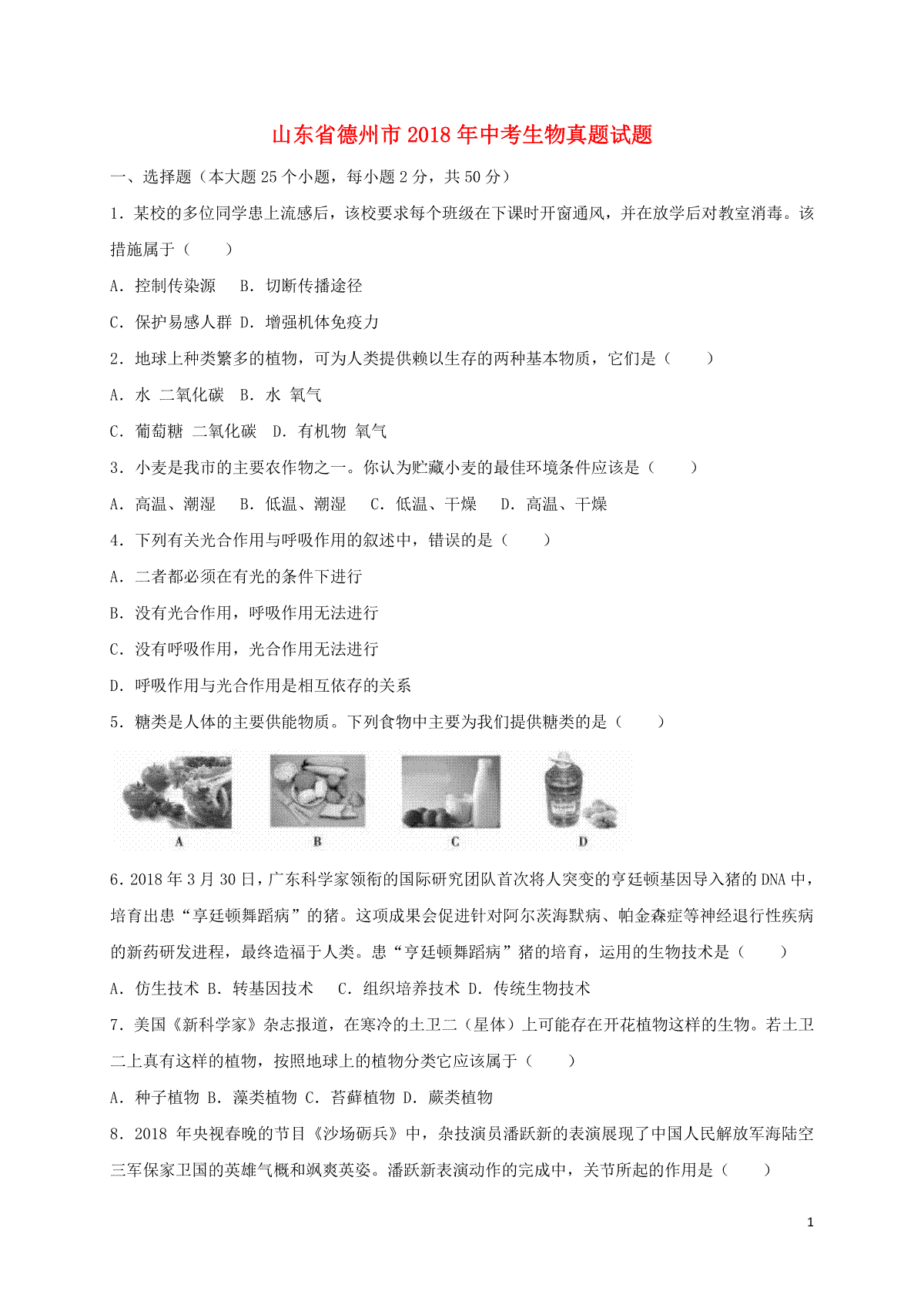 1.山东省德州市2018年中考生物真题试题(含答案)