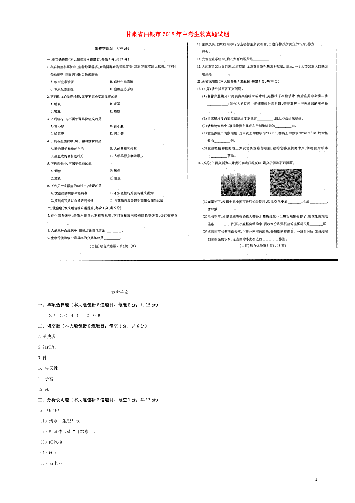 1.甘肃省白银市2018年中考生物真题试题(扫描版,含答案)