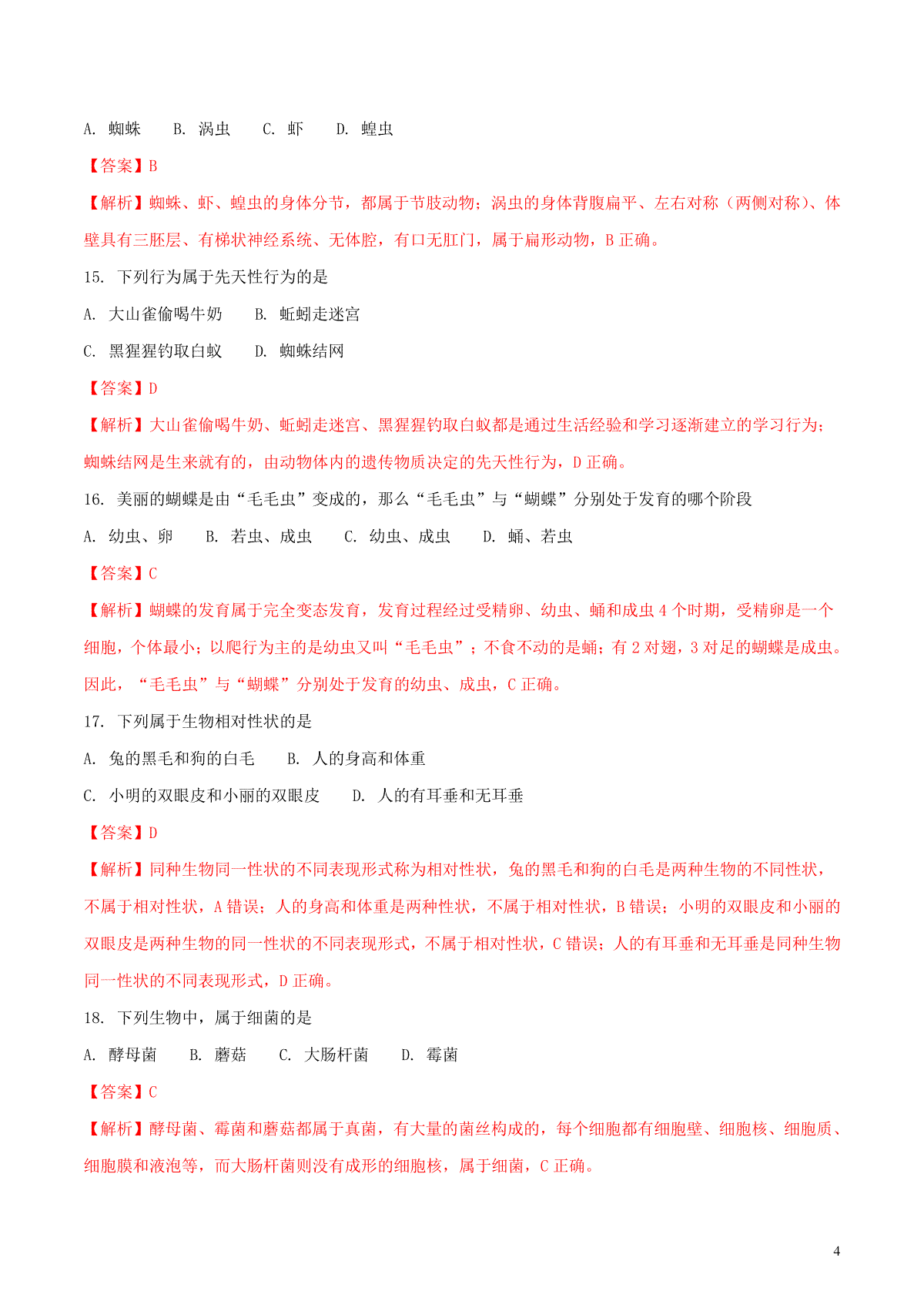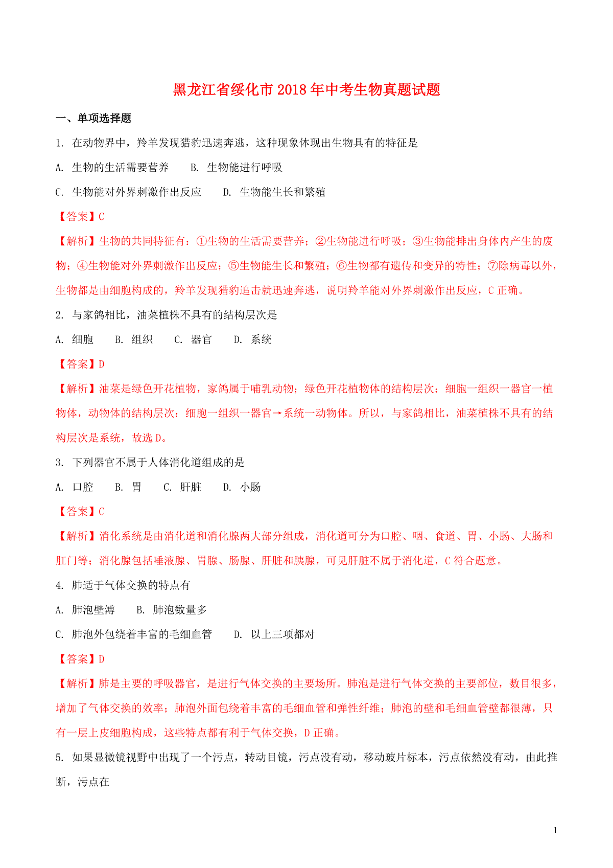 1.黑龙江省绥化市2018年中考生物真题试题(含解析)