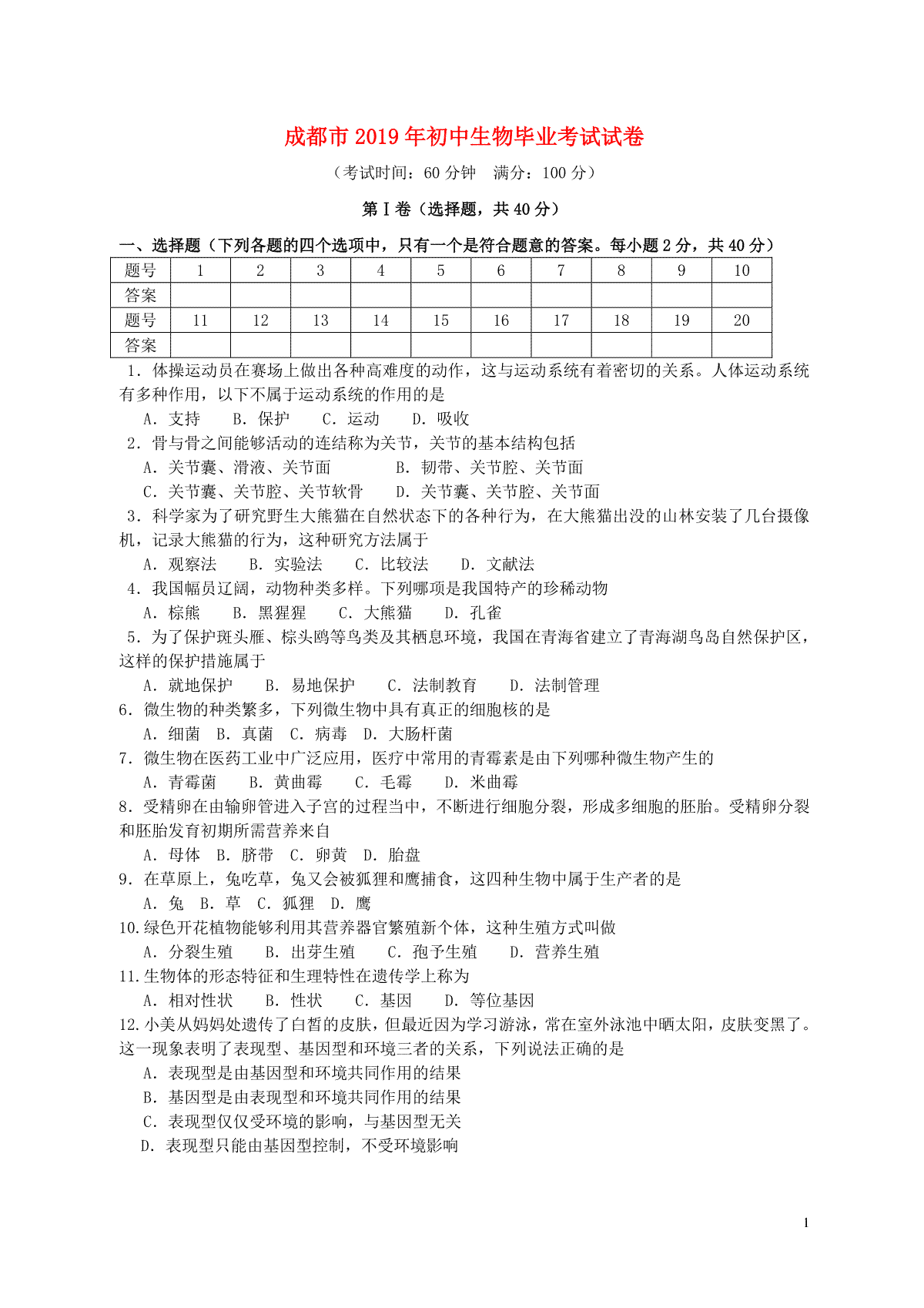 下载四川省成都市2019年中考生物真题试题PDF格式或doc