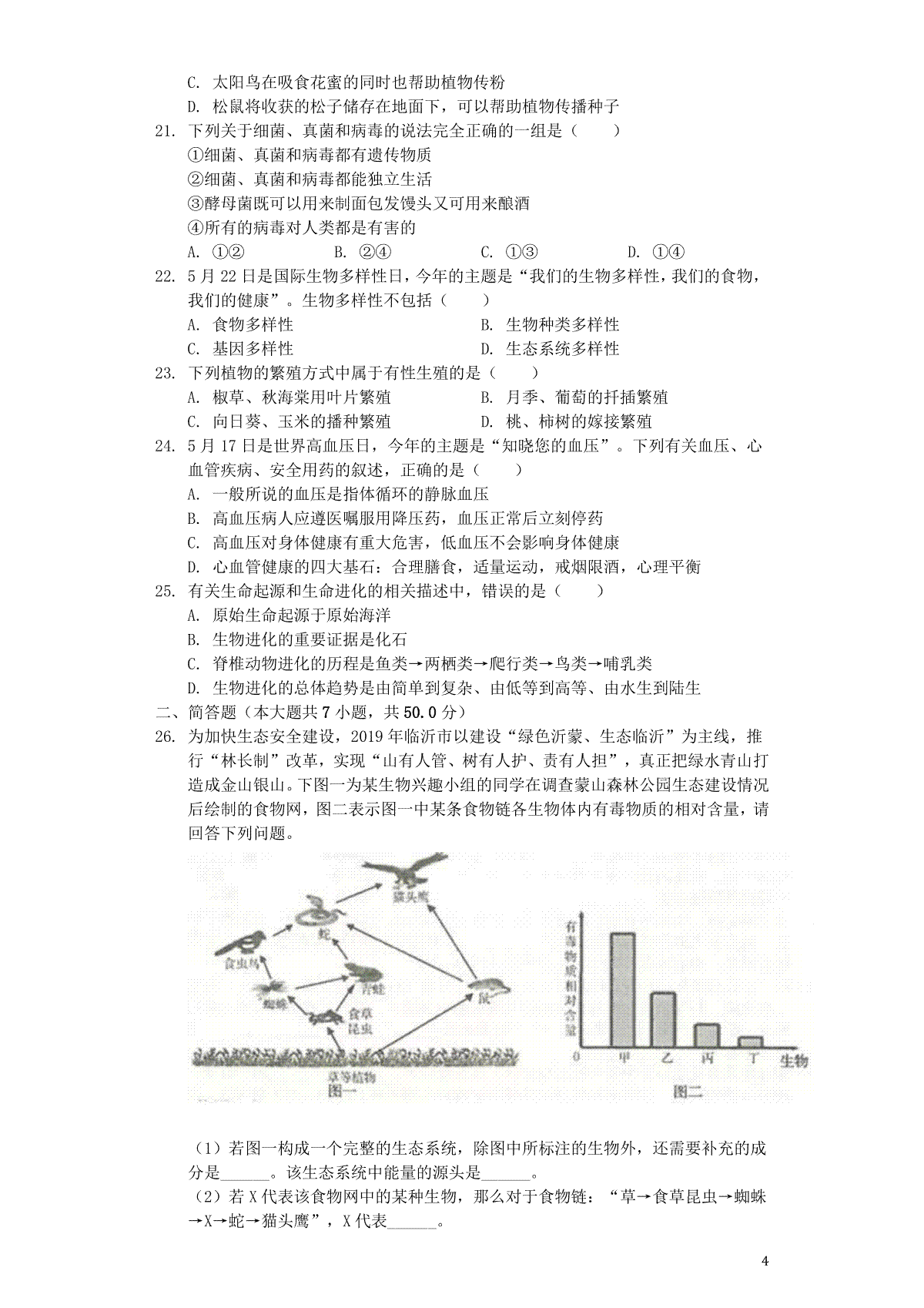 4.山东省东营市2019年中考生物真题试题