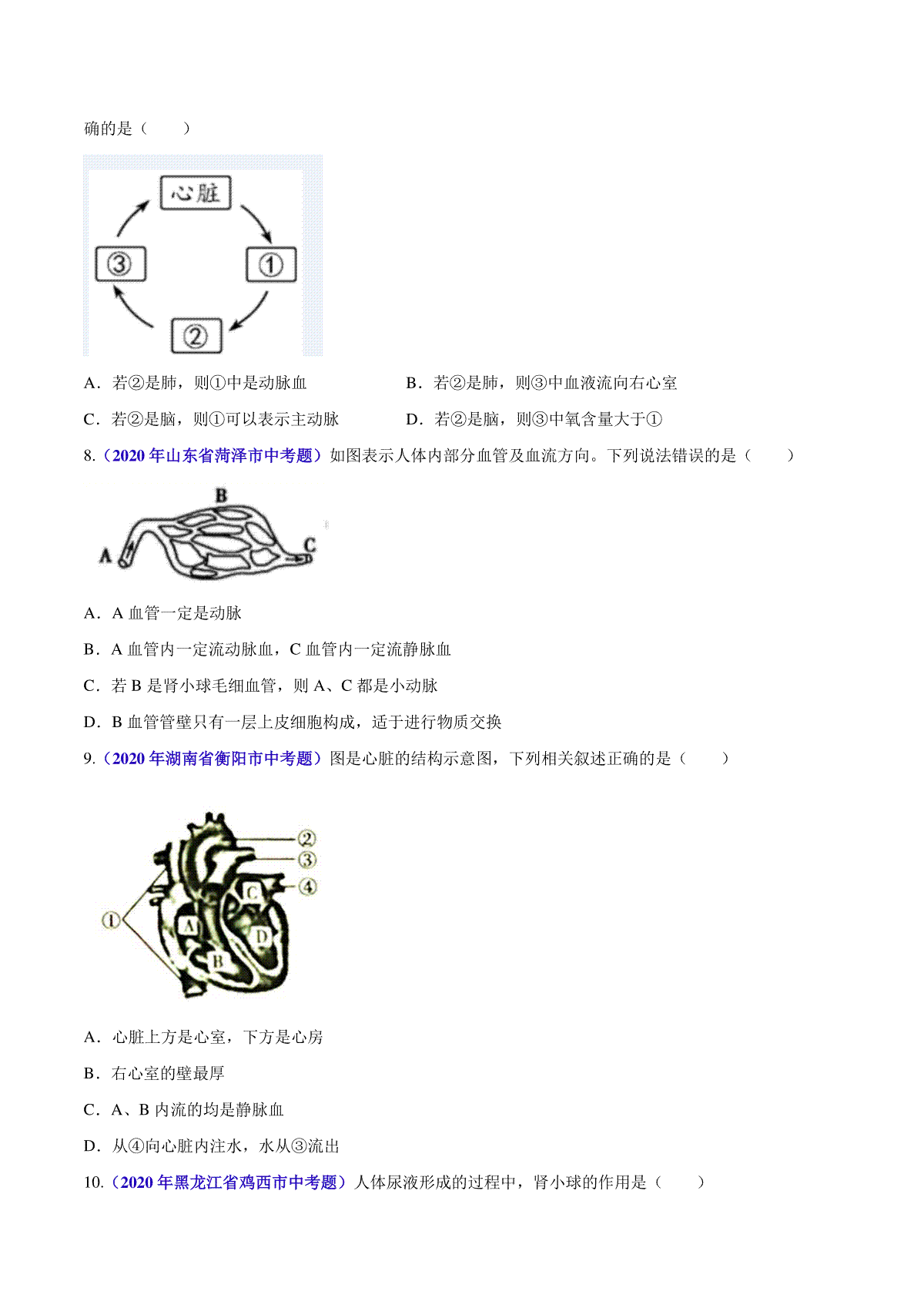 一、专题06 人体内物质运输和废物排出-2020年中考生物真题分项汇编(全国通用)(原卷版)