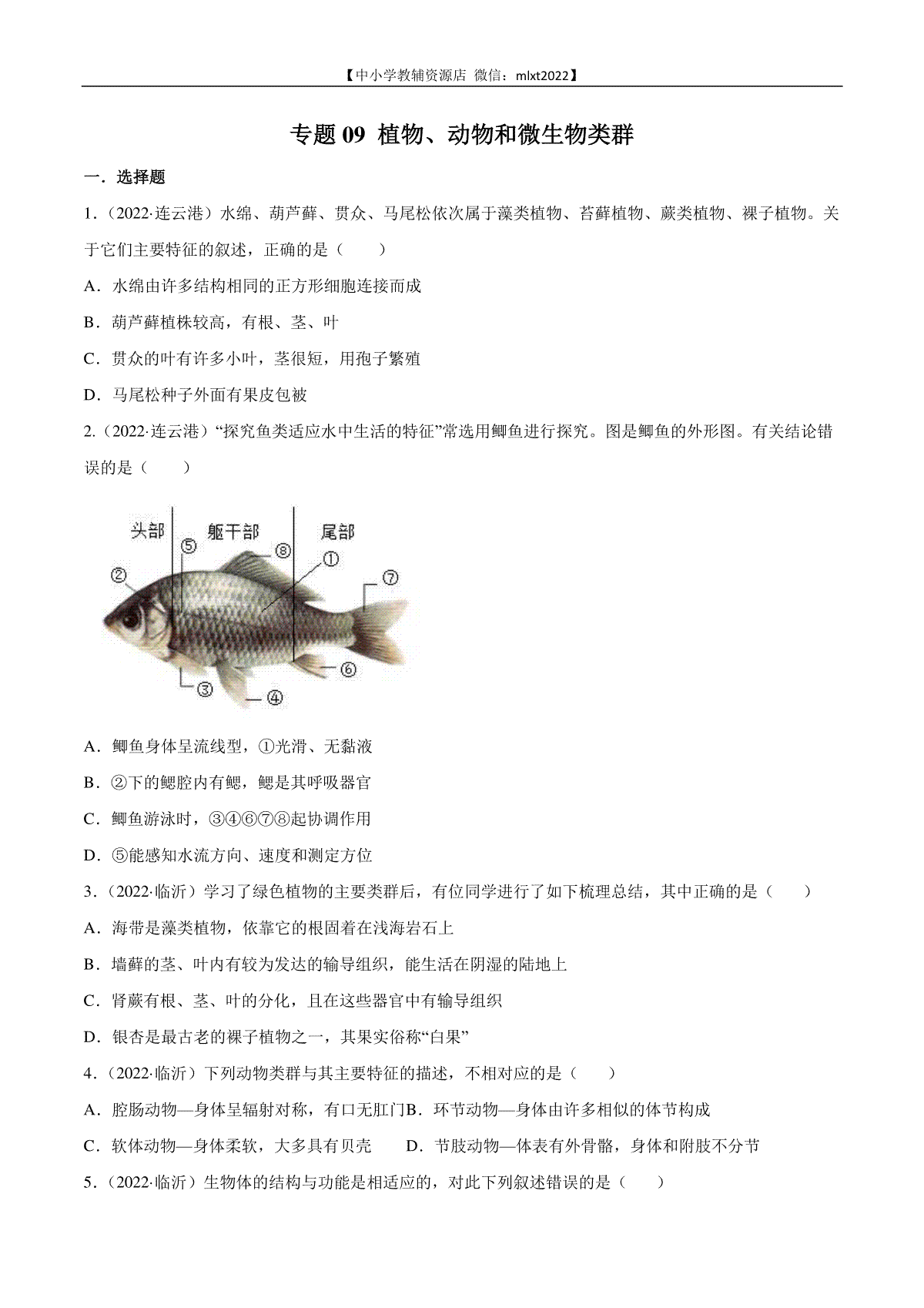 一、专题09 植物、动物和微生物类群-2022年中考生物真题分项汇编 (全国通用)(原卷版)