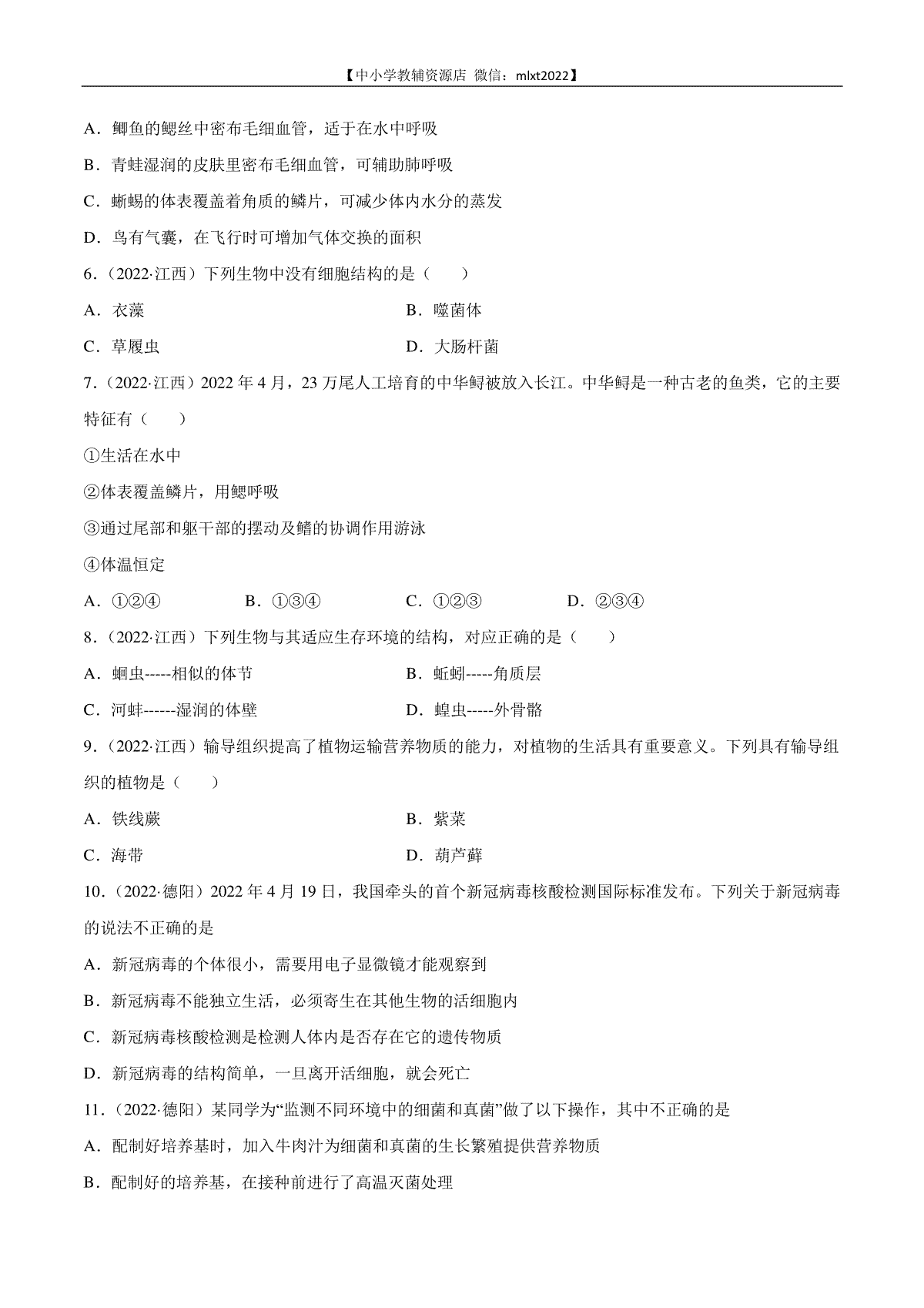 如果你想下载专题09 植物、动物和微生物类群-2022年中考生物真题分项汇编 (全国通用)(原卷版)DOC或PDF版,请点击本文末链接!