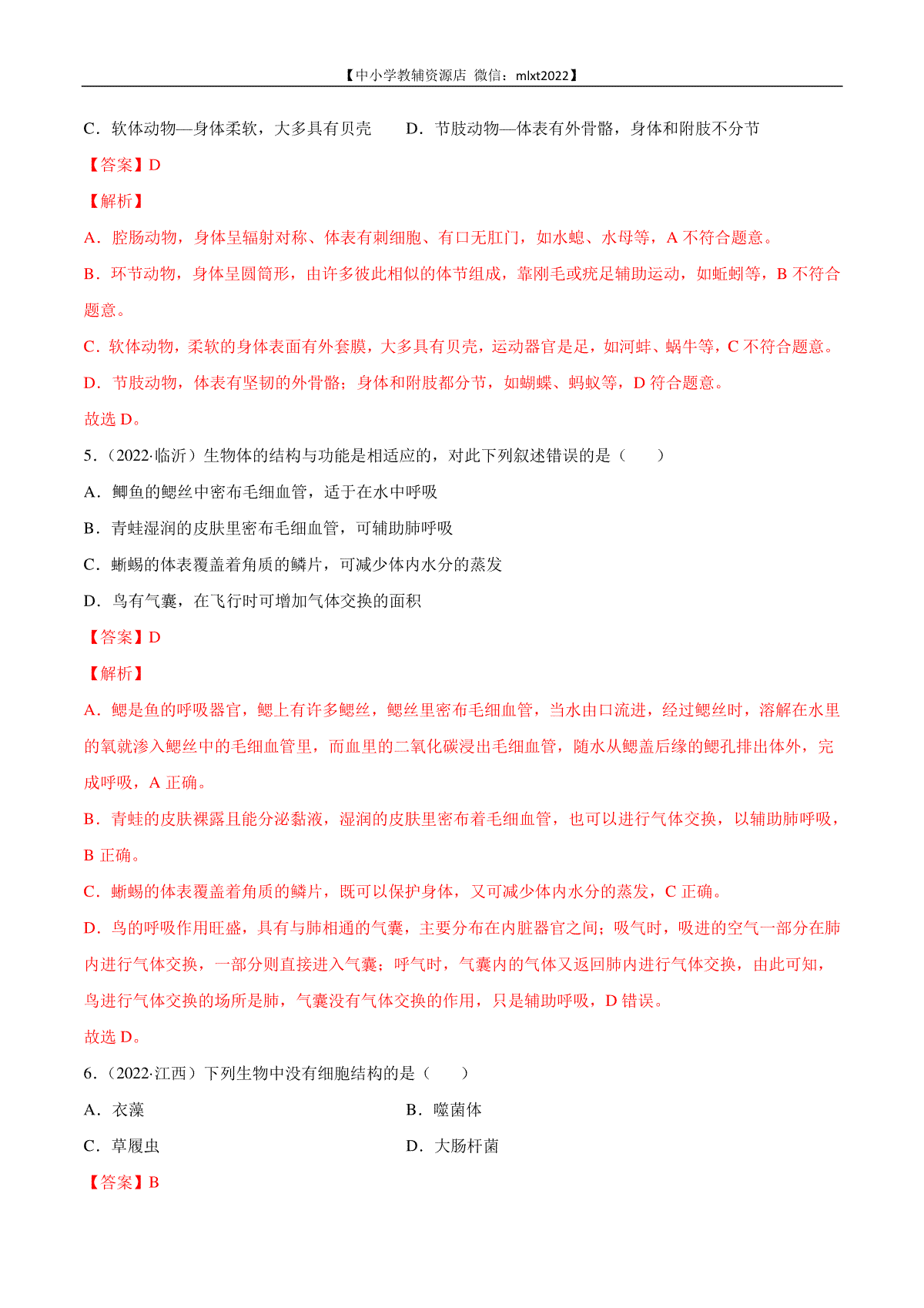 一、专题09 植物、动物和微生物类群-2022年中考生物真题分项汇编 (全国通用)(解析版)
