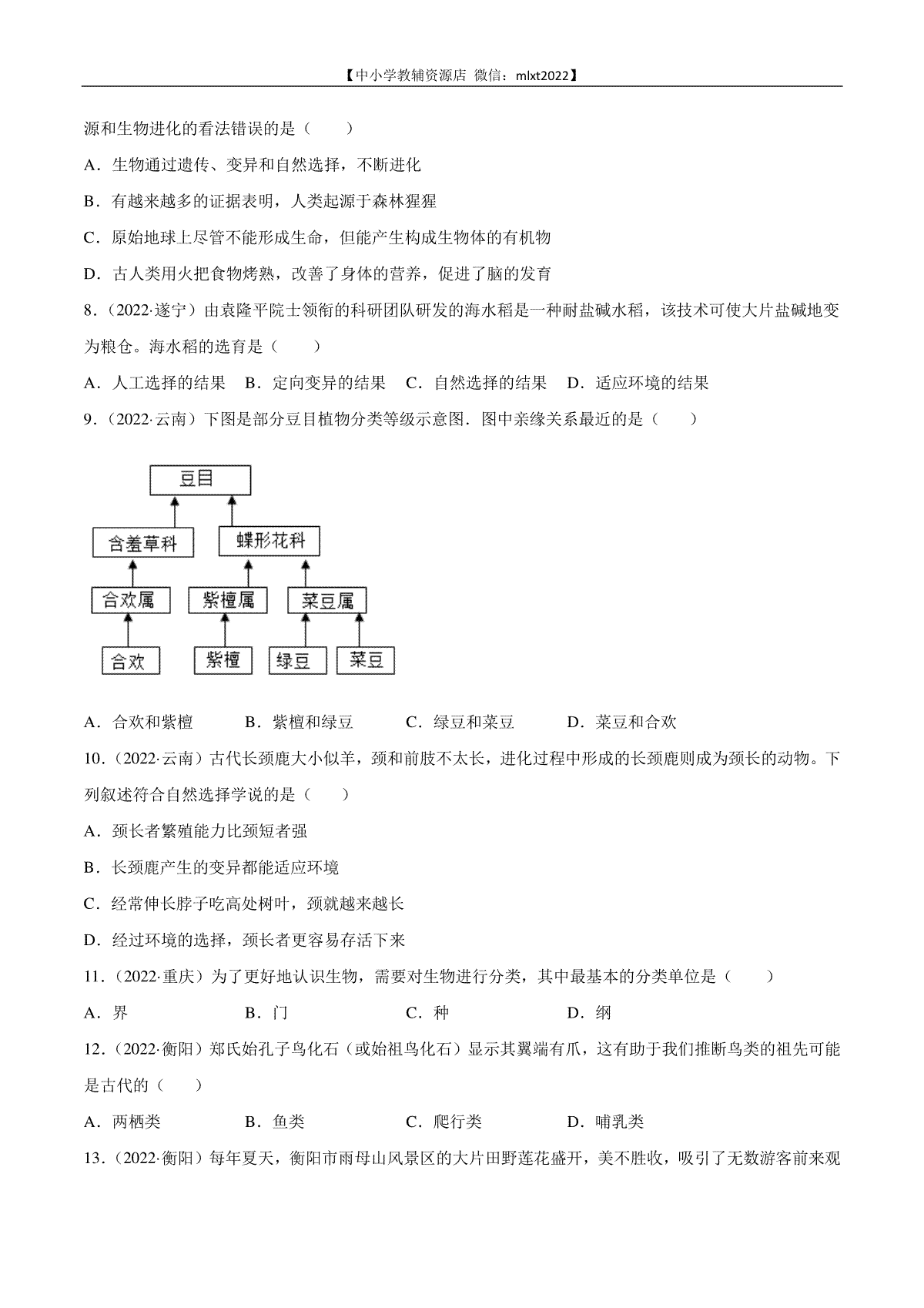 一、专题10 生物的分类、进化和多样性保护-2022年中考生物真题分项汇编 (全国通用)(原卷版)