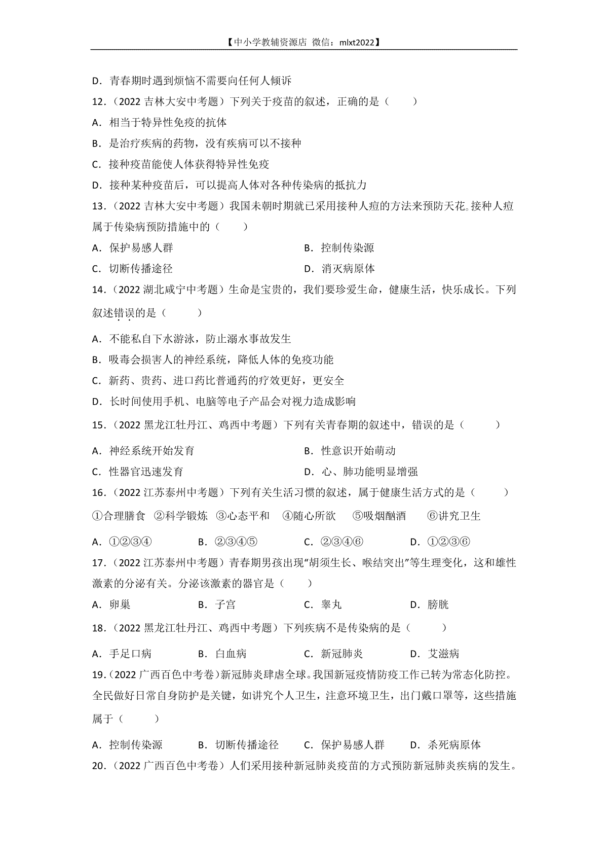 2.专题13 健康地生活-2022年中考生物真题分项汇编(全国通用)(第2期)(解析版)