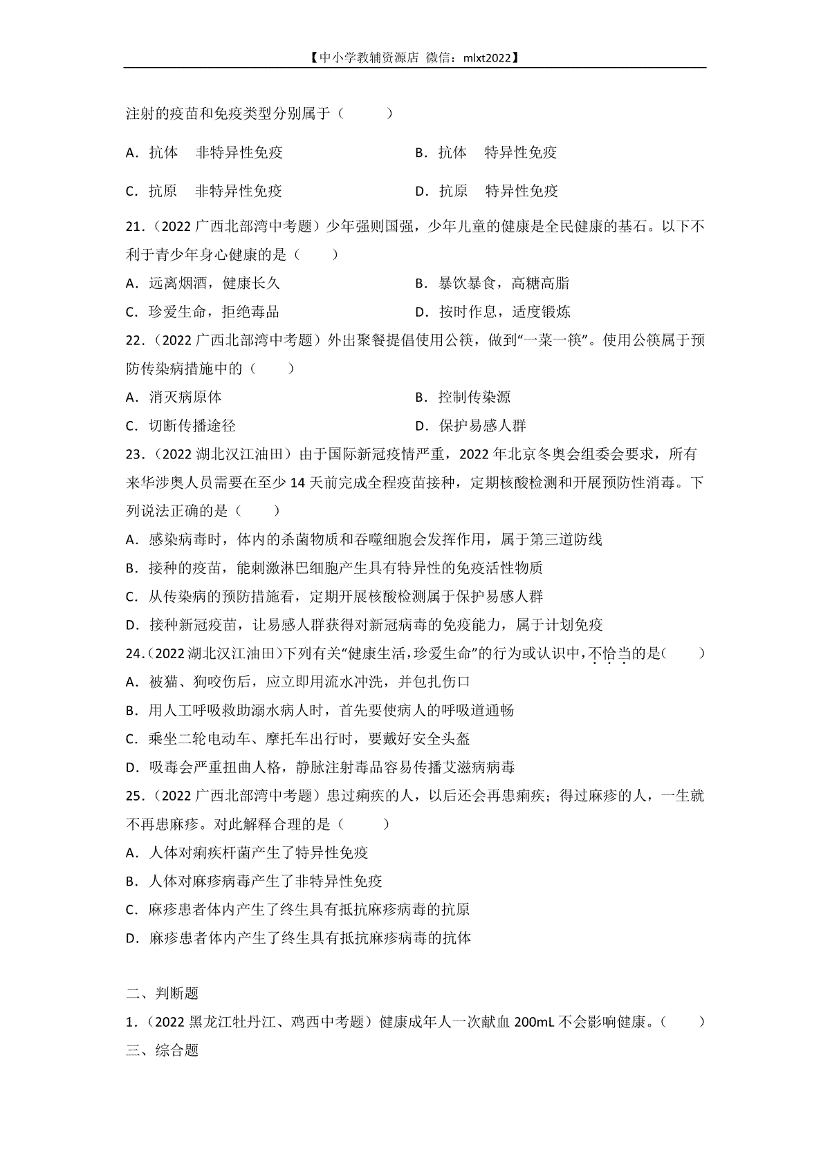 一、专题13 健康地生活-2022年中考生物真题分项汇编(全国通用)(第3期)(原卷版)