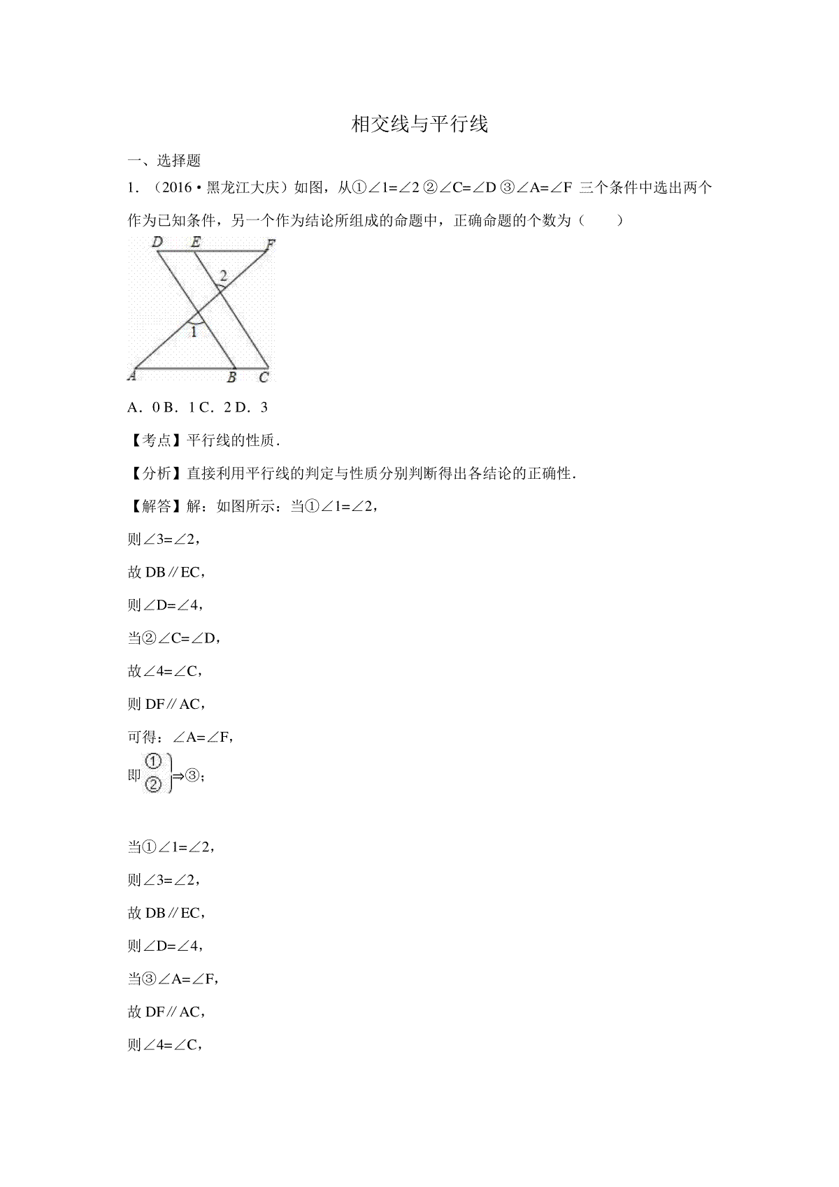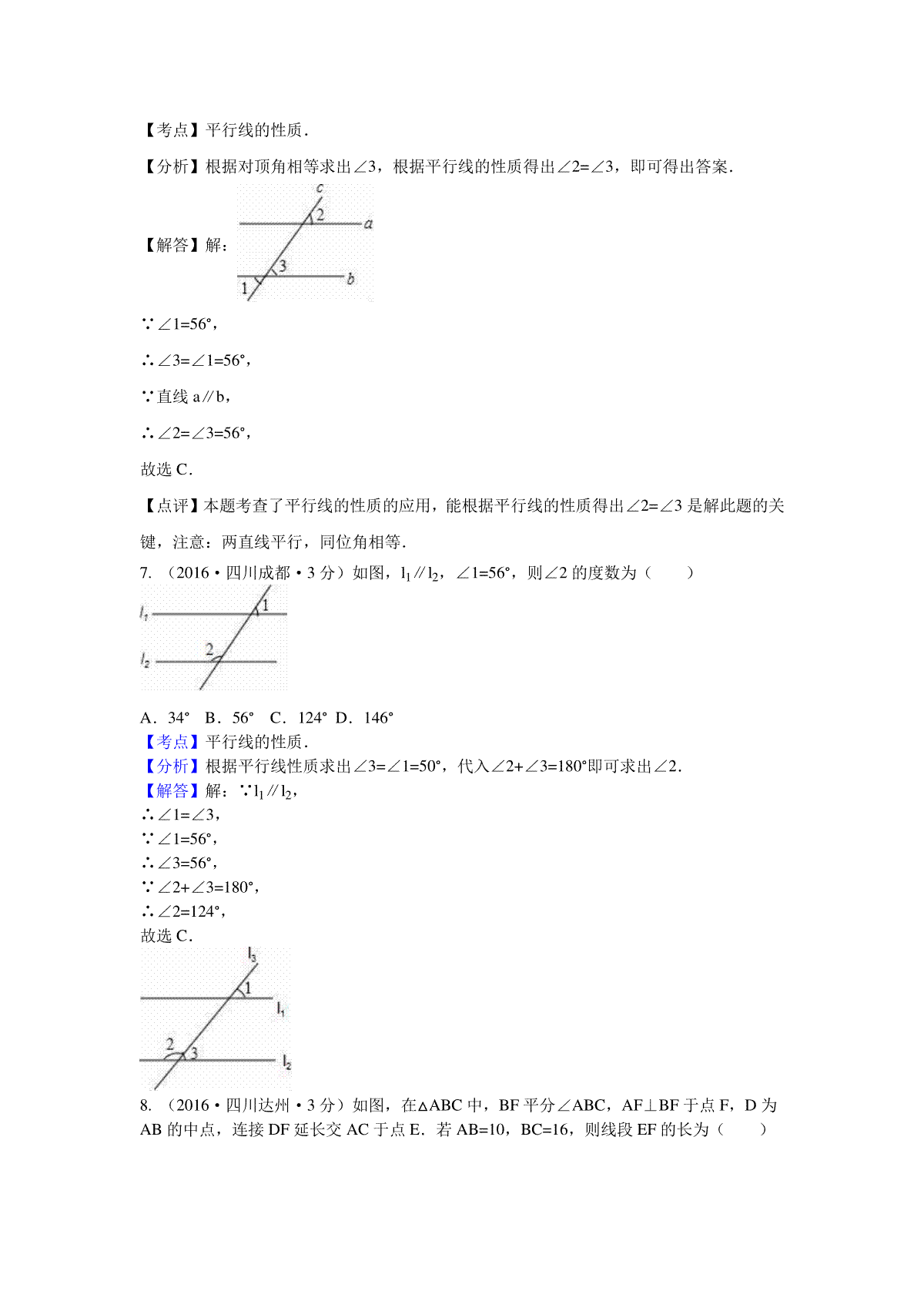 一、2016年各地中考数学解析版试卷分类汇编(第一期):相交线与平行线