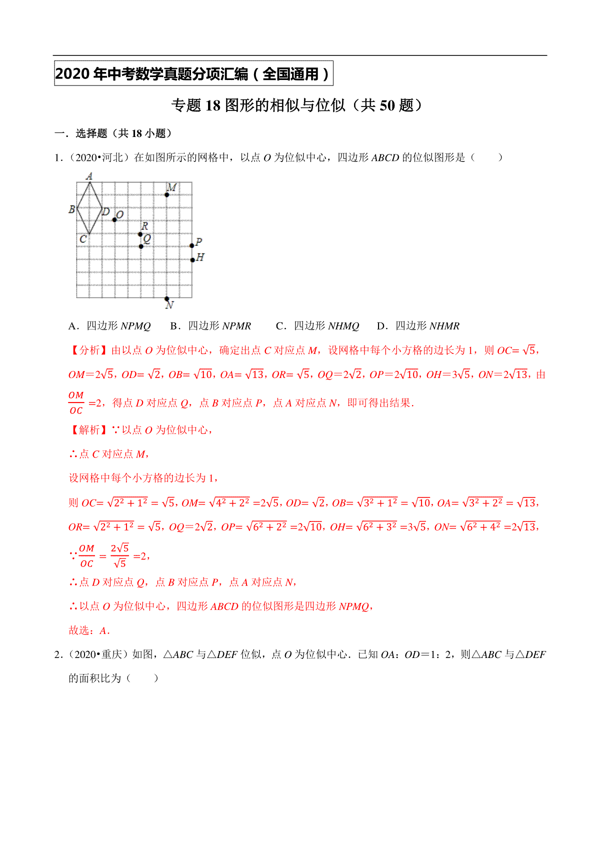 1.专题18图形的相似与位似(共50题)-2020年中考数学真题分项汇编(解析版)【全国通用】