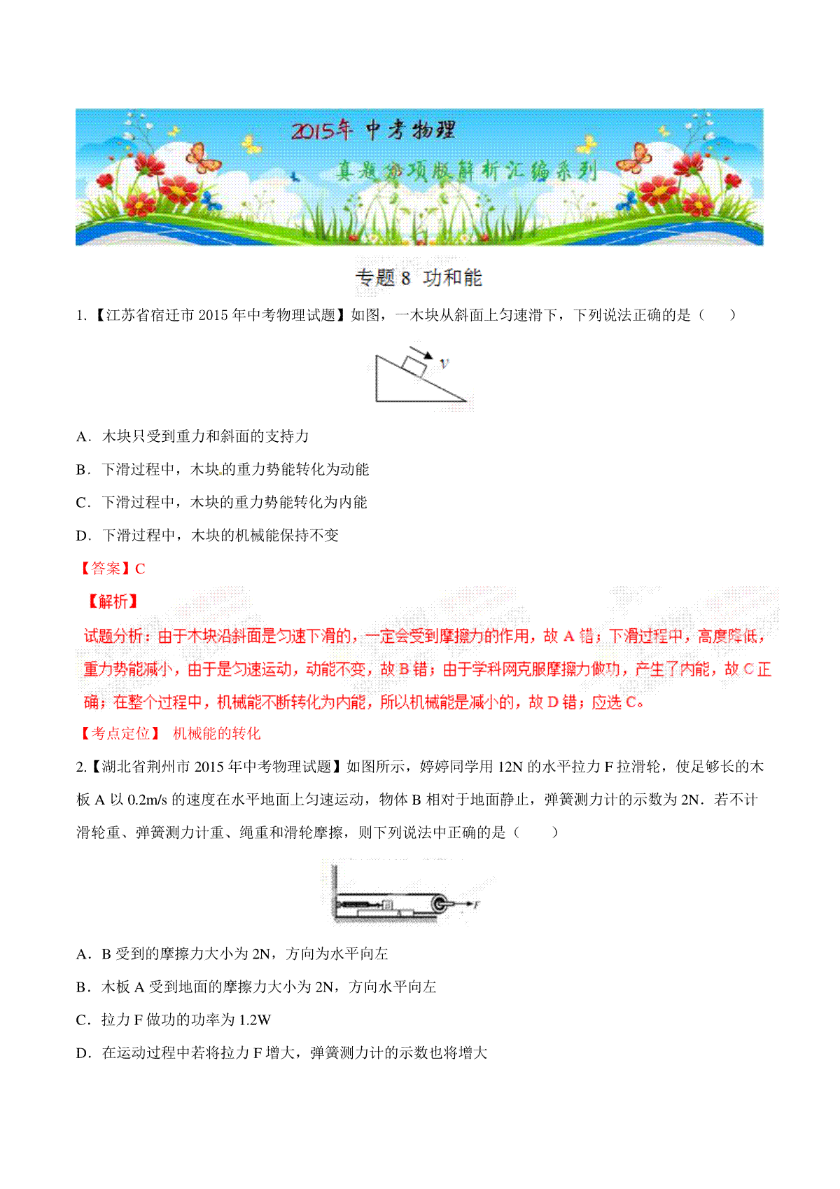 1.专题08 功和能(第01期)-2015年中考物理试题分项版解析汇编(解析版)