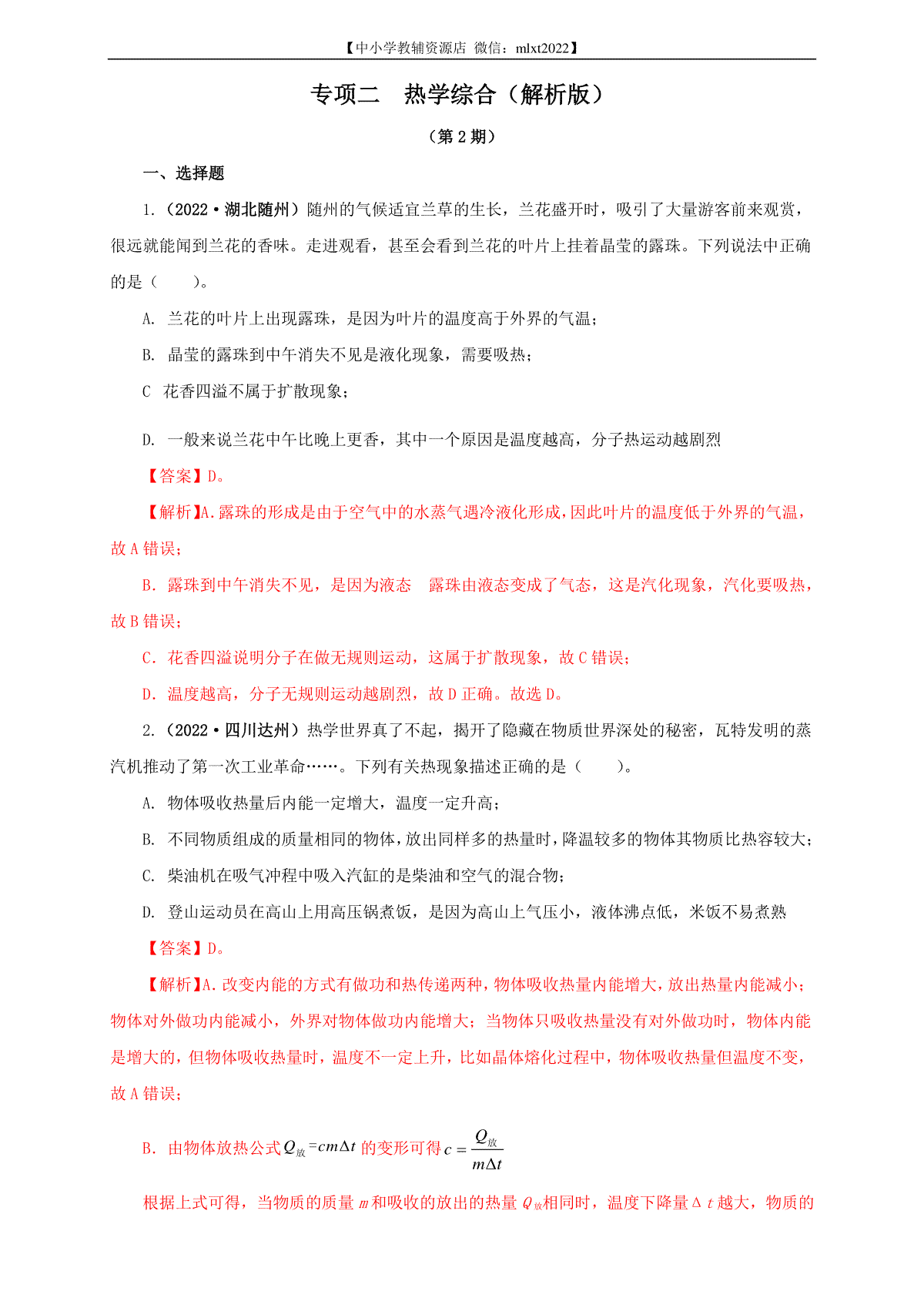专项二 热学综合(解析版)(第2期)于近期开考,本次考试对考生对知识的掌握参考价值大,为了方便大家复习掌握错题!小编在下文为大家准备了专项二 热学综合(解析版)(第2期)试卷及答案解析详情,仅供考生参考。