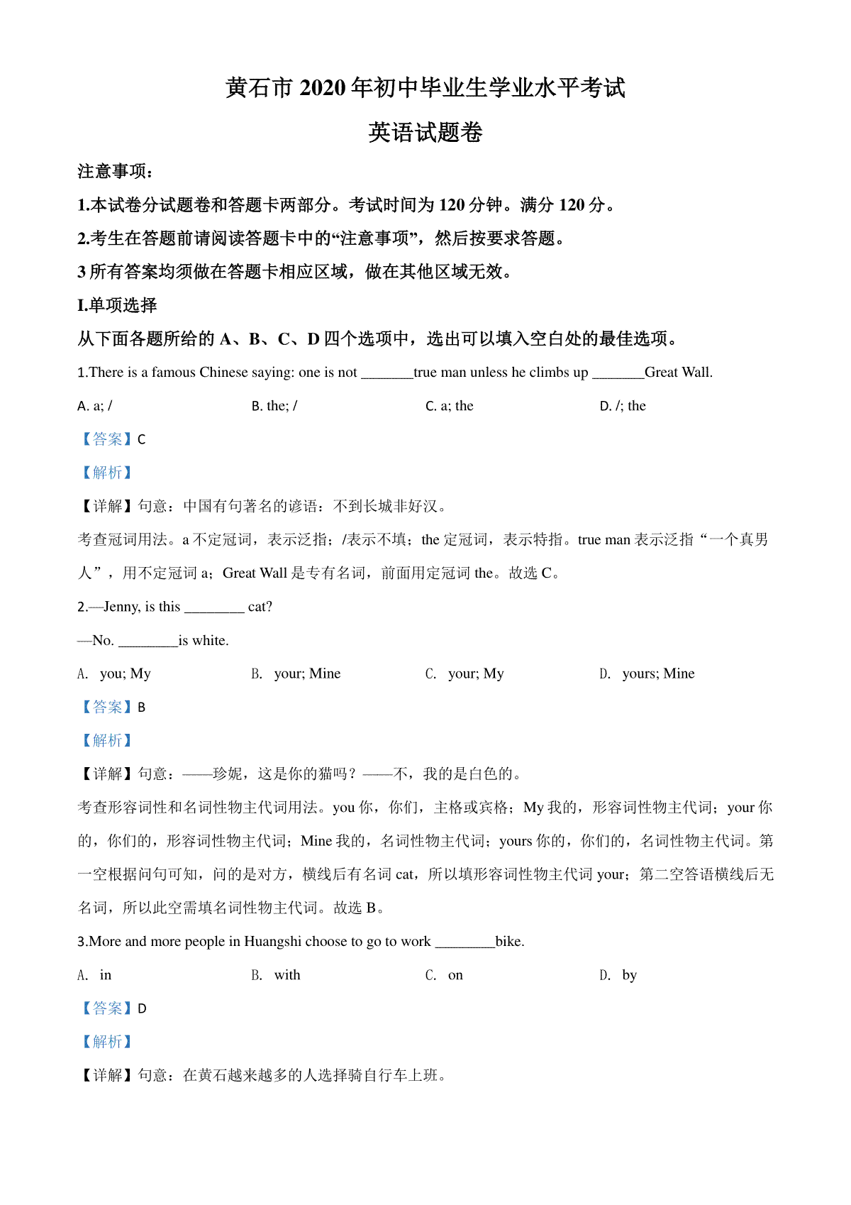 一、精品解析:湖北省黄石市2020年中考英语试题(解析版)