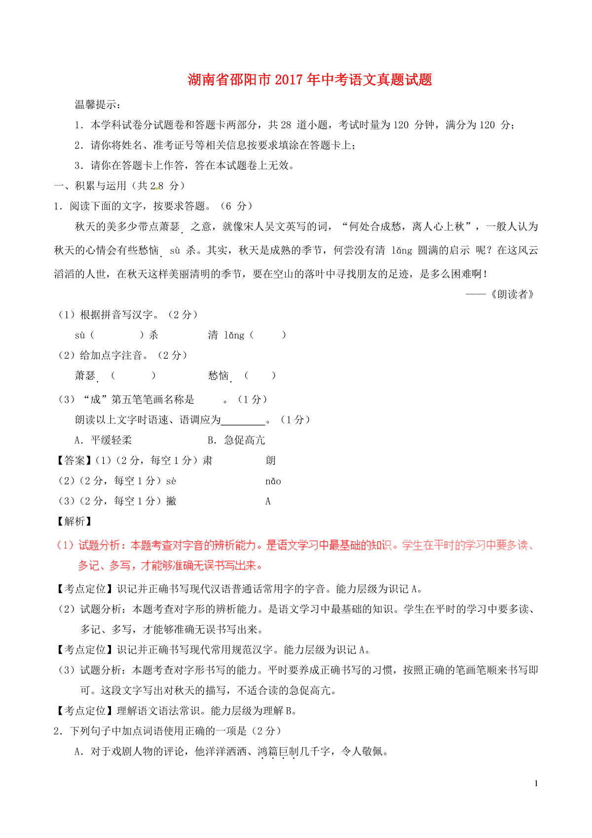 2.湖南省邵阳市2017年中考语文真题试题(含答案)