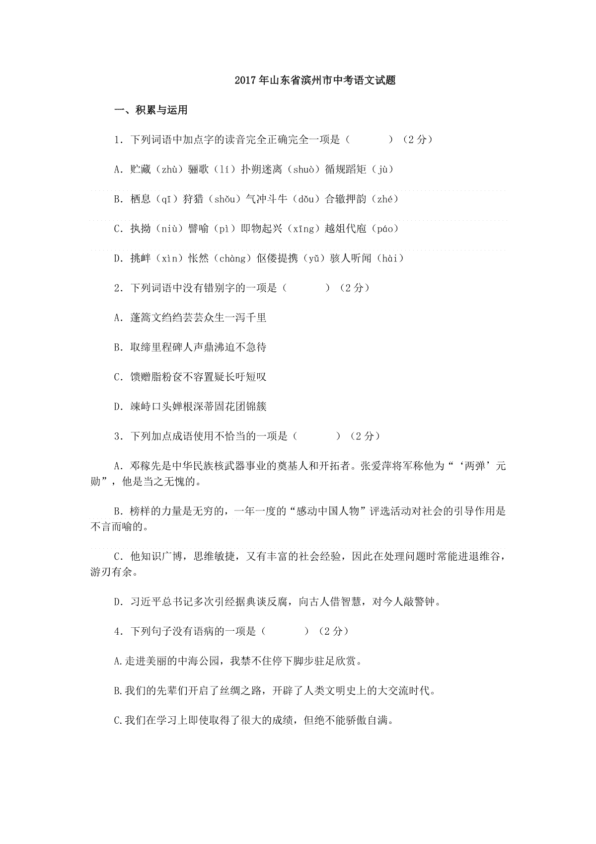 下载2017年滨州中考语文试题及答案PDF格式或doc