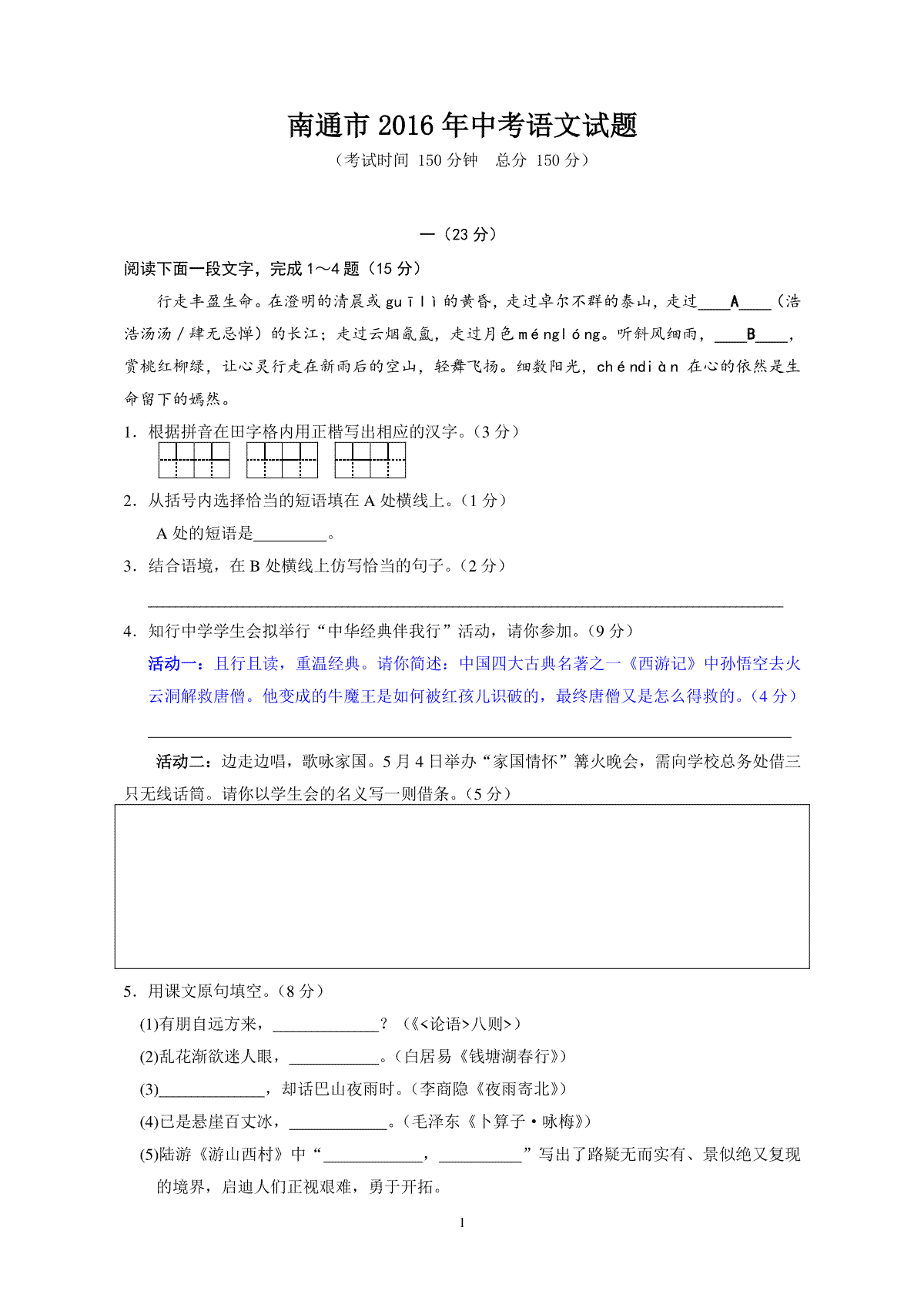 1.2016年江苏省南通市中考语文试题及答案
